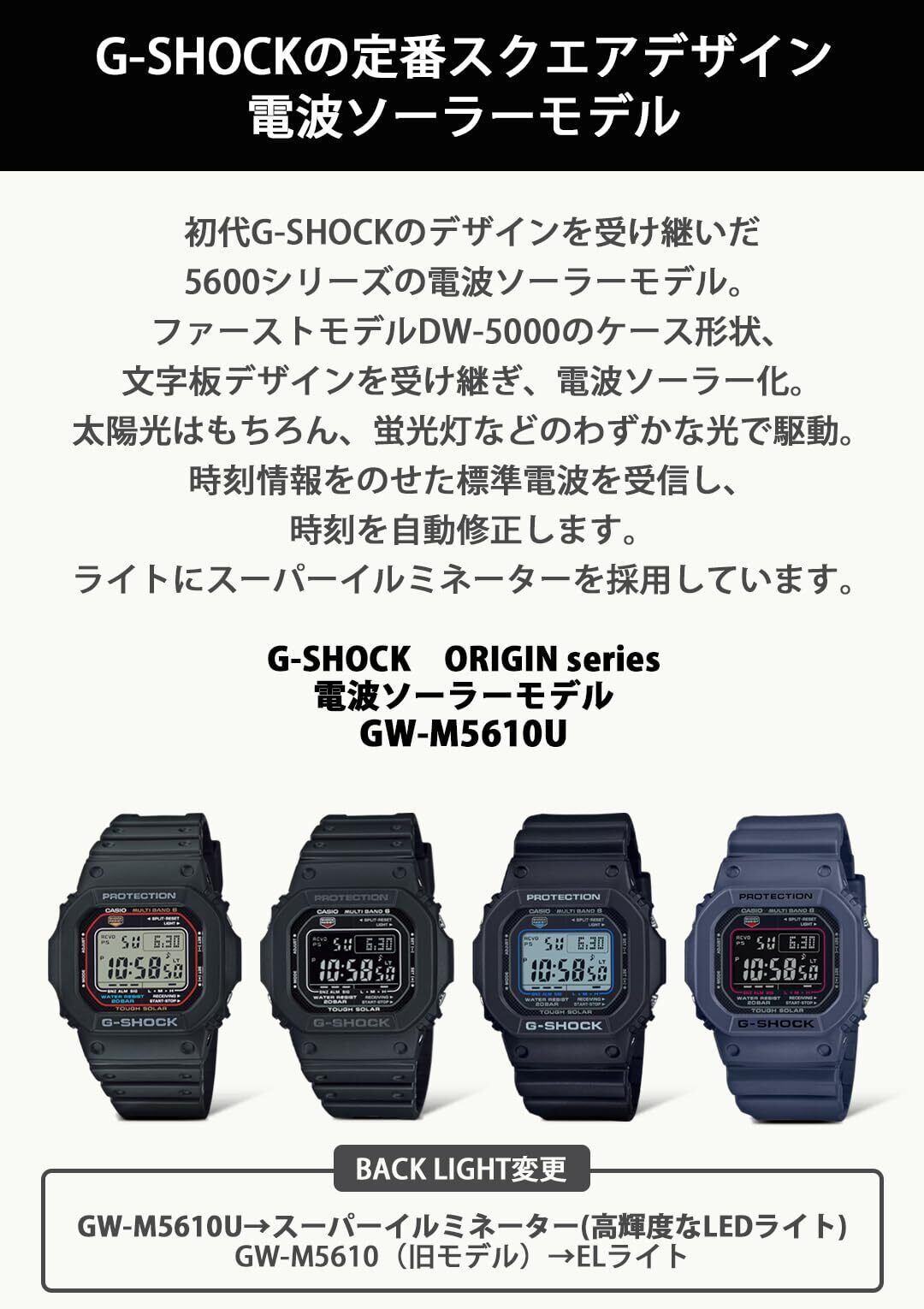 1983年に誕生したDW-5000Cのデザインを継承し、タフソーラー、マルチバンド6を搭載し進化を果たした人気のGW-M5610シリーズ。ファーストモデルDW-5000のケース形状、文字板デザインを受け継いだクラシカルなデザインはそのままに、ブラックのケース・バンドに反転液晶を組み合わせました。色埋め部分すべてにダークグレーを採用し、全身モノトーンでクールに仕上げています。タフネスをコンセプトに進化を続けるG-SHOCKの中で、ファーストモデルのDNAを受け継ぎ、更に進化したモデルです。