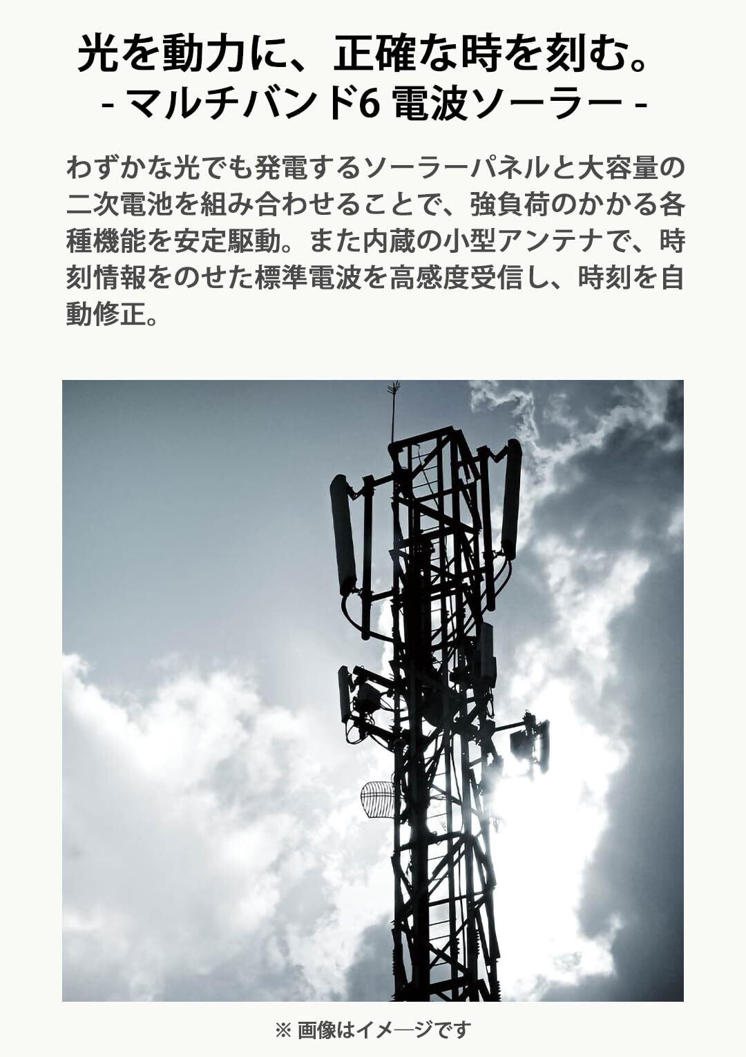 ●電波受信機能:自動受信(最大6回/日)(中国電波は最大5回/日)<日本>受信電波:JJY、周波数:40kHz/60kHz(福島/九州両局対応モデル )<北米地域>受信電波:WWVB、周波数:60kHz<ヨーロッパ地域>受信電波:MSF/DCF77、周波数:60kHz/77.5kHz<中国>受信電波:BPC、周波数:68.5kHz *ホームタイム設定を受信可能な都市に設定すると、都市に合わせた局を受信します。尚、時差は設定された都市によって設定されます。