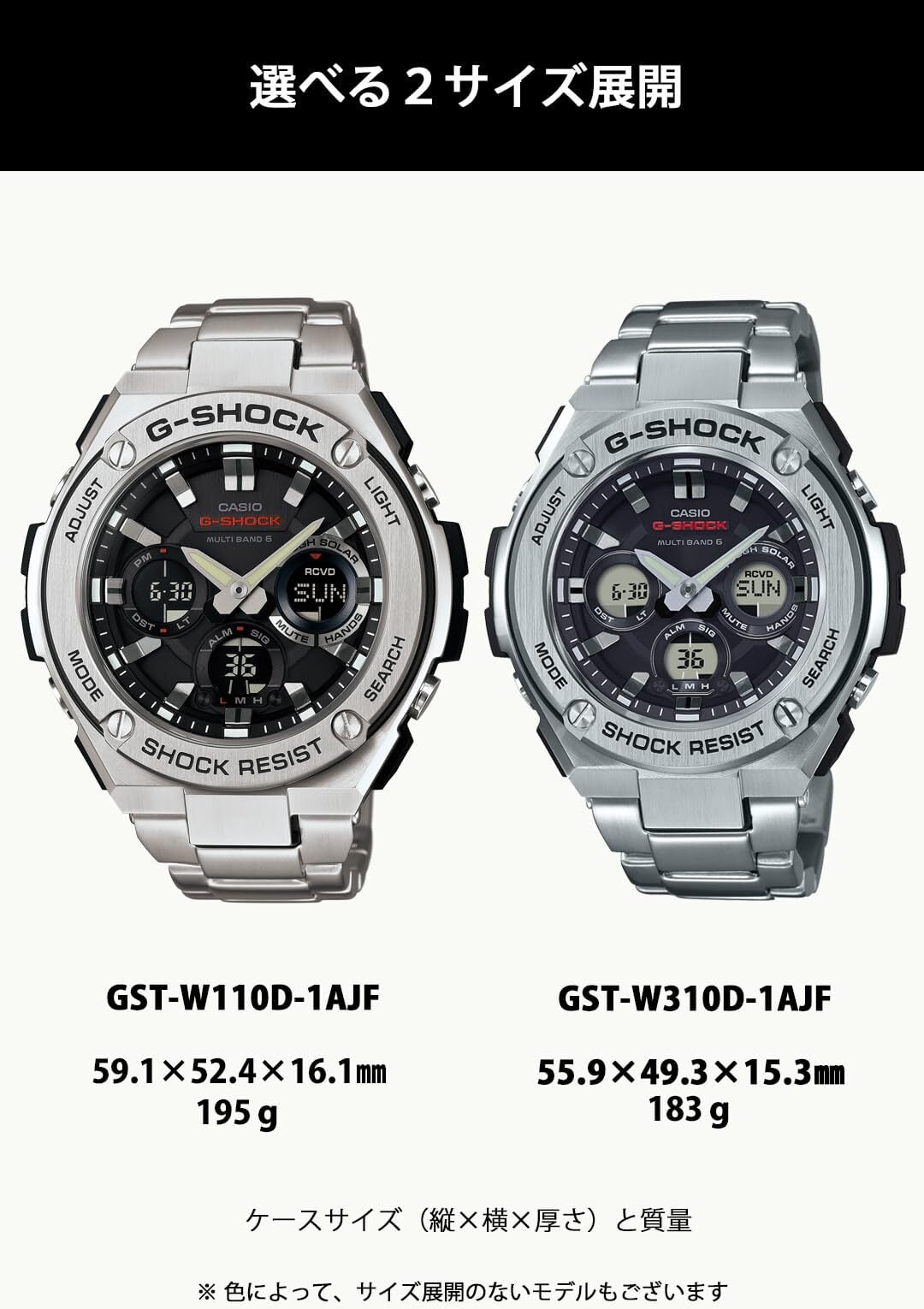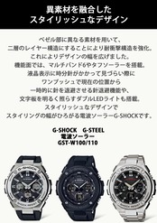 タフネスを追求し進化を続けるG-SHOCKから、「レイヤーガード構造」を採用し、デザインの幅を広げた「Gスチール」のNewモデルが登場します。メタルの硬質感と重厚感を備えるGST-W110Dに、ブラック×ゴールド、ブルー、ホワイトの3色を新たにラインアップ。発電効率に優れた遮光分散型ソーラーパネルを採用することで、美しい発色を実現しました。ブラック×ゴールドは、精悍でエネルギッシュな表情に仕上げ、ブルーはクールな印象に、ホワイトは爽やかでクリーンなデザインに仕上げました。メタルと樹脂を融合させ、タフネスデザインのバリエーションを広げた「Gスチール」です。