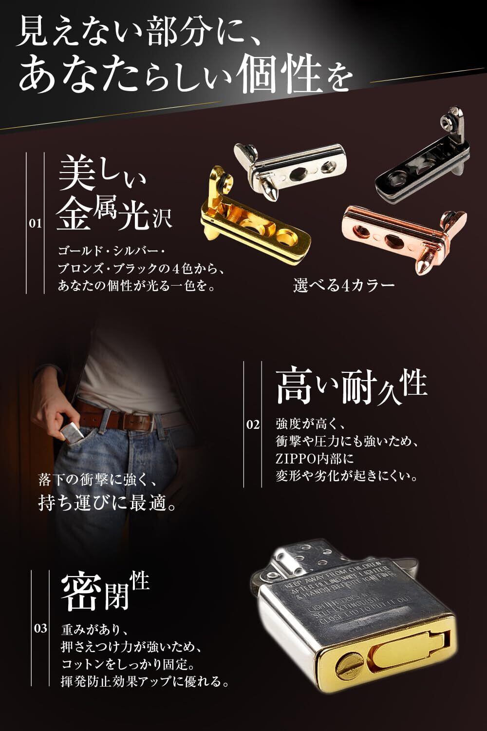 【選べる4色で愛着アップ】ZIPPOの雰囲気を損なわず、ブラック・シルバー・ゴールド・ブロンズの4色から選べるメタルパッド。機能性だけでなくジッポ カスタムパーツとしても人気で、ジッポ 揮発防止と見た目の両立を叶えます。