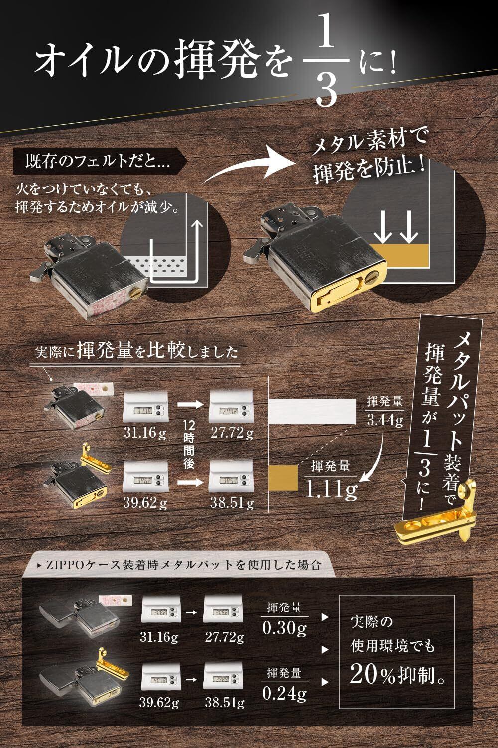 【補充頻度が減って快適】金属製ジッポ メタルパッドの効果で、オイルの減りがゆるやかに。ジッポ 揮発防止パーツの中でも、検証結果に基づくzippo 揮発防止力を備え、日常使いの補充頻度を減らしたい方に最適です。