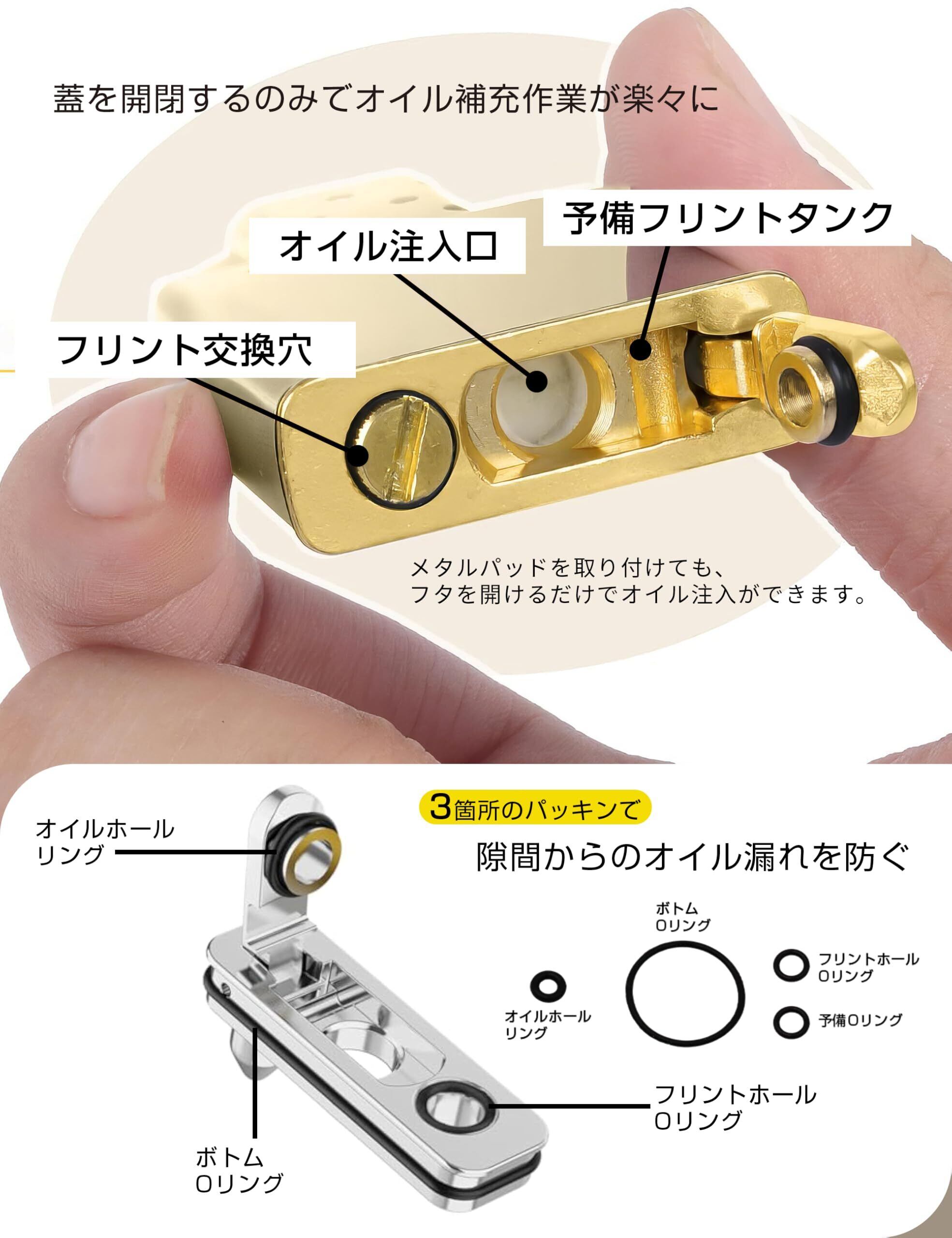 【揮発量を抑える構造でオイル揮発を最大3倍カット】 メタルパッドがライターのオイル注入部を密閉。従来比3倍の揮発防止効果を実現。揮発防止メタルパッドを装着することで、オイルの揮発を効果的に防ぎ使用期間を延長できるほか、オイル漏れや周囲への臭いも軽減でき、さらにゴムパッドと比べて耐久性・耐油性に優れているため長期間にわたってご使用いただけます。