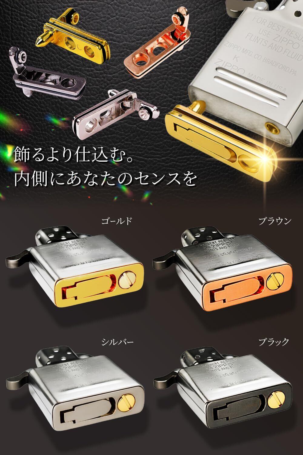 【4色展開・こだわりが光るカスタムパーツ】ジッポの機能性を高めるだけでなく、見えない部分まで自分らしさを演出できる4色展開(シルバー/ブラック/ゴールド/ブラウン)。高級感あるメタル素材が、手にした瞬間から特別感を演出。人と差をつけたい方や、こだわりの一台を仕上げたい方にぴったりです。