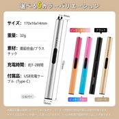 【仕様】寸法:約1.65㎝x1.65㎝x17㎝ 重量:約32g 五色選択可 。フル充電には約2時間かかります。ガス、オイル不要。