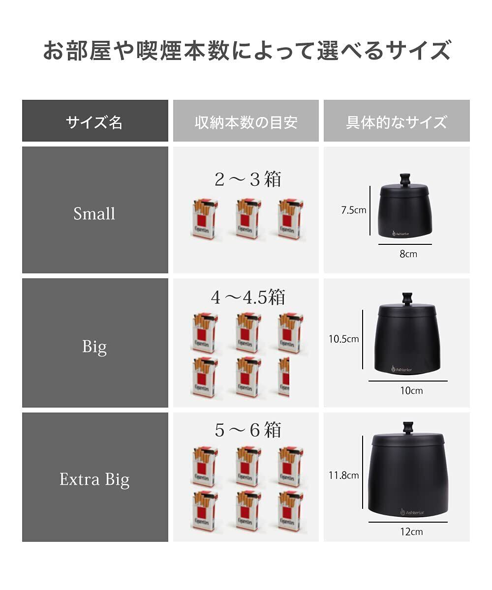 優れたパフォーマンスを:堅牢で厚みと重量のあるステンレス製。熱や水に強く、他の素材や薄いステンレスに比べ長持ち。卓上でも屋外でも:防風&防雨設計なので卓上だけでなく庭やバルコニーなどの屋外使用にも最適です。機能的なデザインへのこだわり: 1.清潔感ある空間演出:吸い殻を隠し清潔感ある空間をキープできる形状。 2.防風設計:風の影響を受けにくいため、自然風、エアコン、人が通った時、書類の開封などで発生する風で灰が舞ってしまわない設計です。3.大容量:1日に何度も吸い殻を捨てに行く手間が省けます。 ヘビースモーカーの方にも最適です。