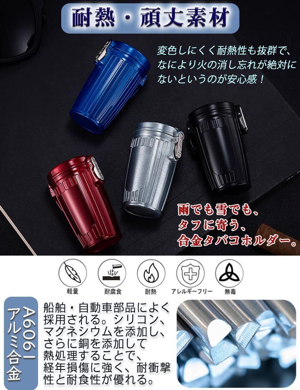 【耐熱・頑丈なアルミ合金素材】強度と耐食性が特徴のアルミ合金を採用します。自動車にもよく使われる素材で、あらゆるシーンに対応OK。雨でも雪でも、タフに寄う、合金タバコホルダー。アルミ合金製品の最大のメリットは、中のパーツをはずしてまるまる水洗いできることできます。変色しにくく耐熱性も抜群で、なにより火の消し忘れが絶対にないというのが安心感があります。