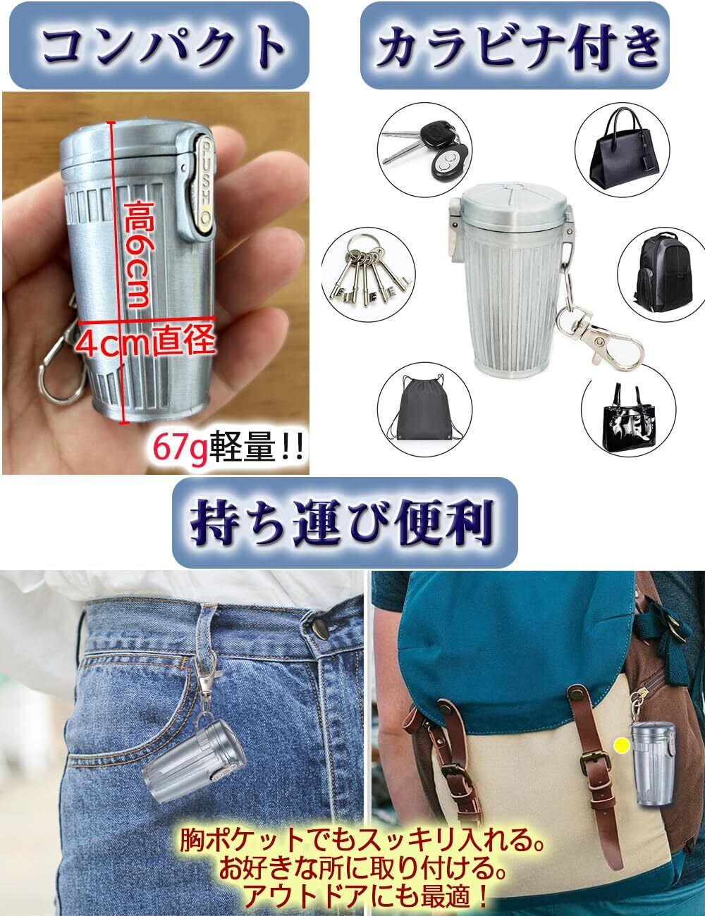 【カラビナ付き】ベルトループやバッグなどに引っ掛けて持ち運べるのが特徴です。キーホルダーでバッグなどに取りつけられるので、殻入れ問題を解決できるし、薬の飲み忘れも防げます。67g軽量で、63mmx41mmx41mmのサイズでコンパクトで割と大容量!収納力では8~10本の一日量のタバコ灰の容量が確保されます。