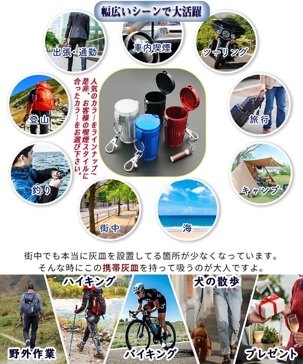 カラビナが付属しているので、バッグやベルトに簡単に取り付けられ、持ち運びも楽々です。軽量でコンパクトなデザインは、旅行やキャンプなどのアウトドアシーンでの使用にも最適。この携帯灰皿は、喫煙具としてだけでなく、ピルケースや小物入れとしても活躍します。