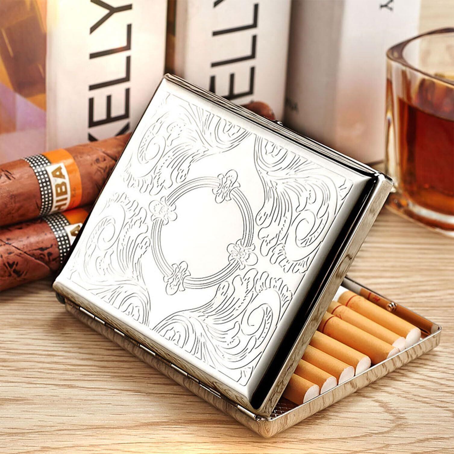 【84-100mmサイズに対応】このレトロなシガレットケースは長さ107mmで、レギュラー/キングまたは100mmサイズのタバコを18-20本まで収納できます。このタバコケースは金属製でしっかりしていてタバコが折れたり曲がったりせず、中が密封できるので葉がこぼれたりもしません。丁寧に一本ずつ並んだ巻きタバコは、いつもよりちょっぴり上品。大切に味わいたくなる不思議な魅力もあります。