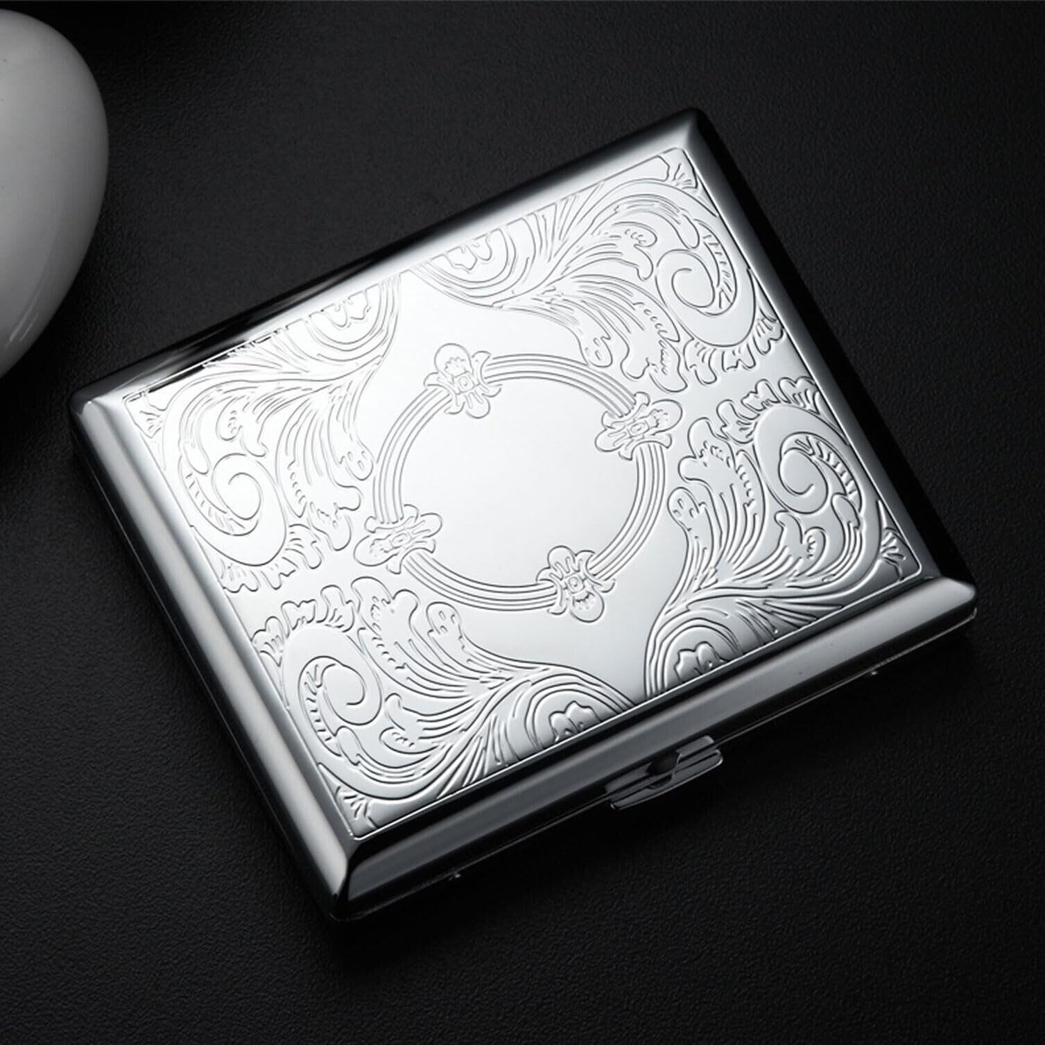 こちらのシガレットケースは、最大20本のタバコを収容できるデザインで、外出先でもスマートにタバコを持ち運ぶことができます。シルバーのメタリックな質感は、男性にも女性にもぴったりで、どんなシーンにも映えます。