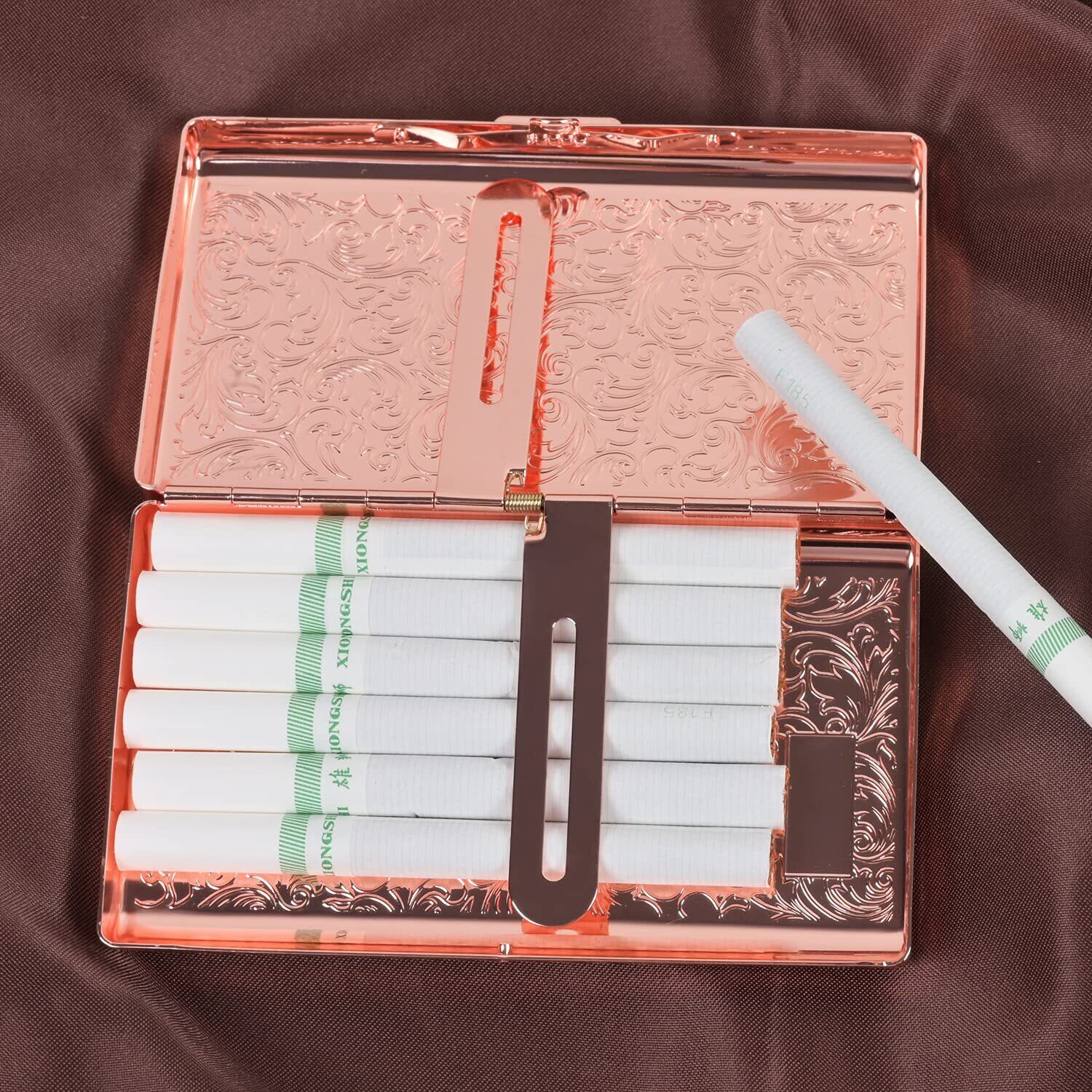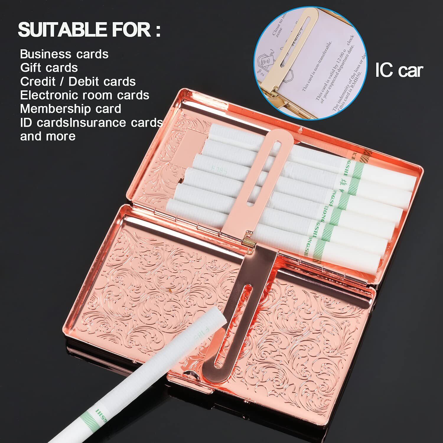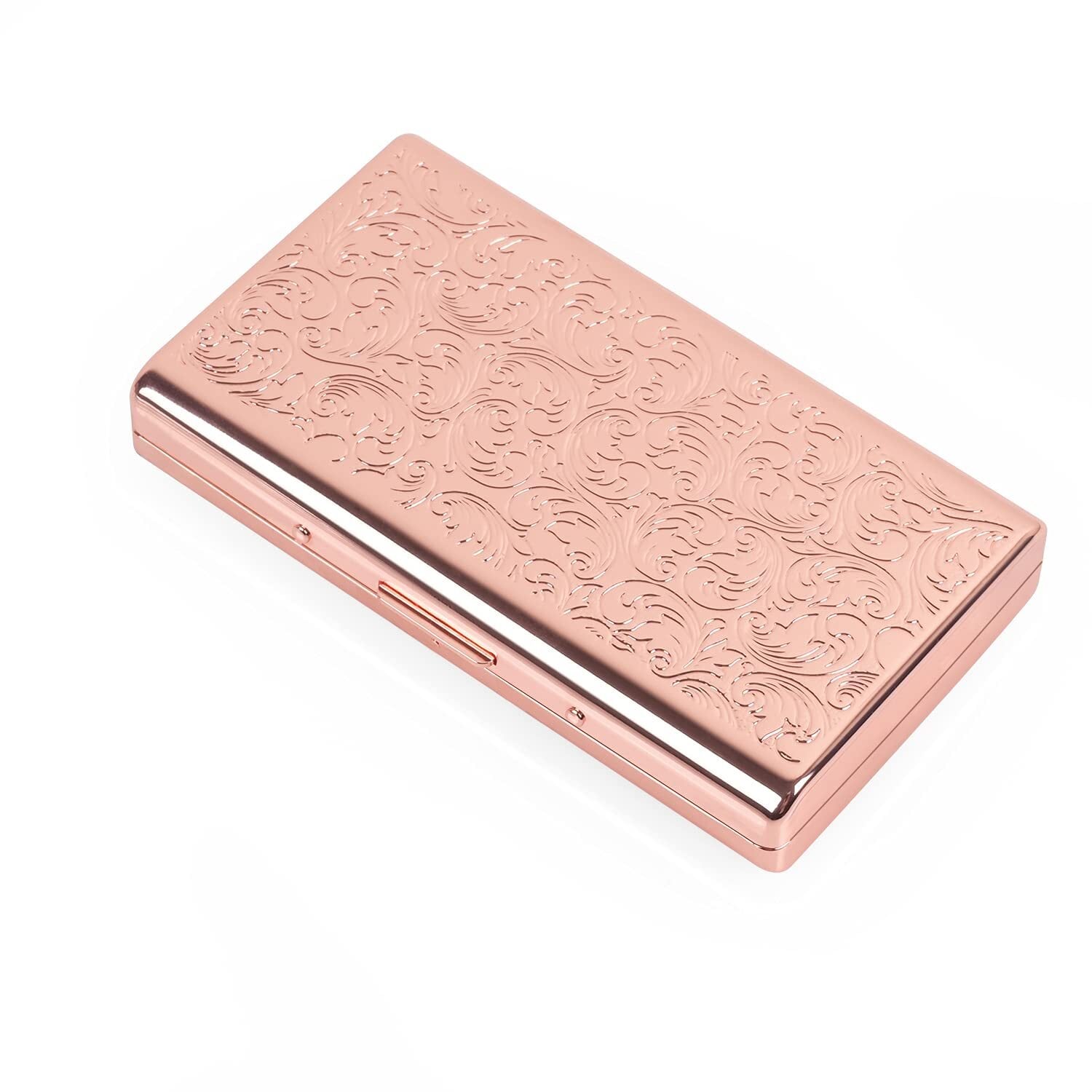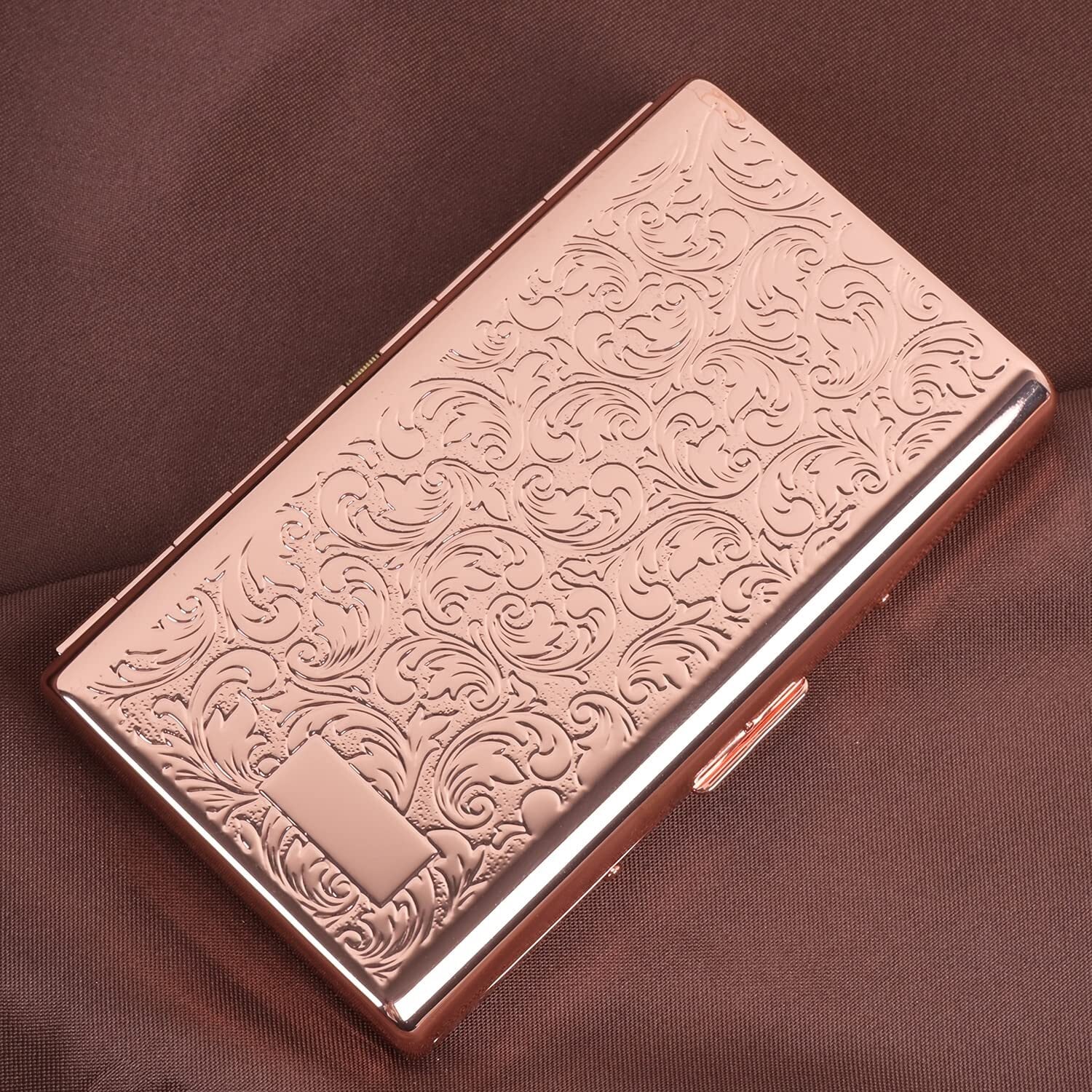 レトロメタルシガレットケース-14本の100mmシガレット用両面スプリングクリップオープンポケットホルダー、男性と女性用のクレジットカードホルダー保護セキュリティウォレット(ローズゴールデン)