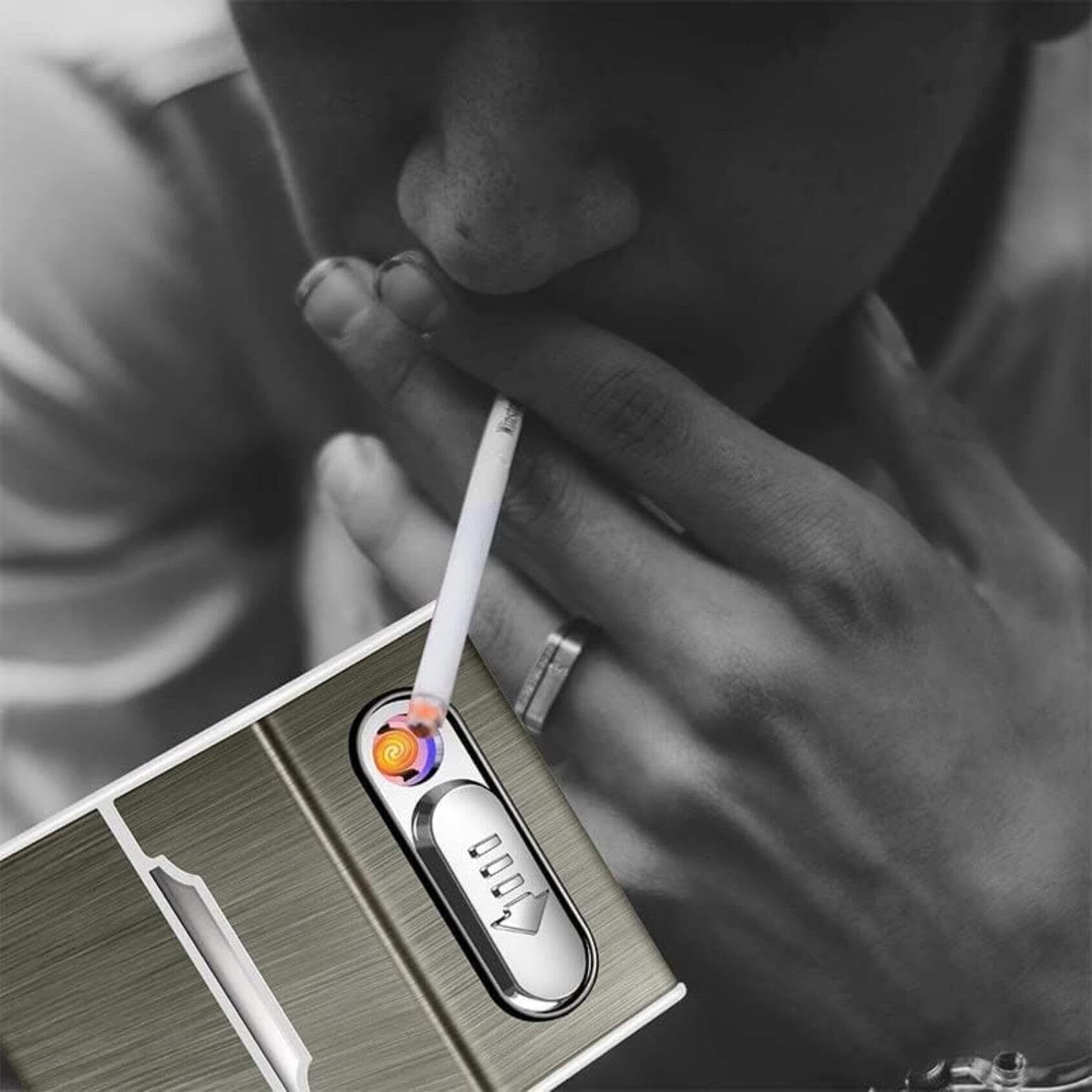 2-in-1 デザイン: ライター付きアルミニウム シガレット ケース 電子機能: 充電式、防風、炎なし。