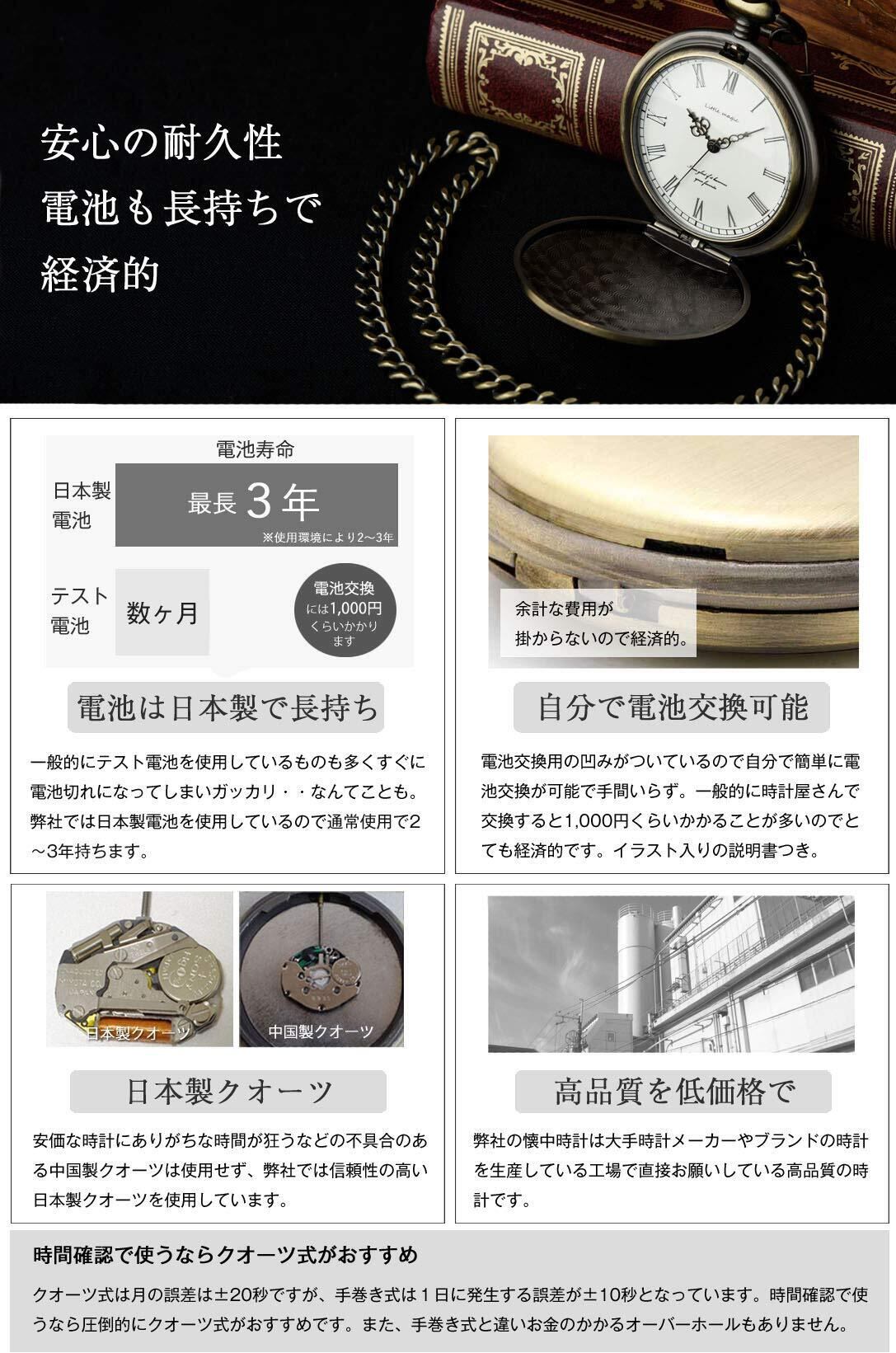この懐中時計には、日本製の高品質なムーブメントを採用しており、正確な時刻管理が可能です。機械式時計ならではの温かみと、安定した性能で、日常使いにも特別な日の使用にも適しています。