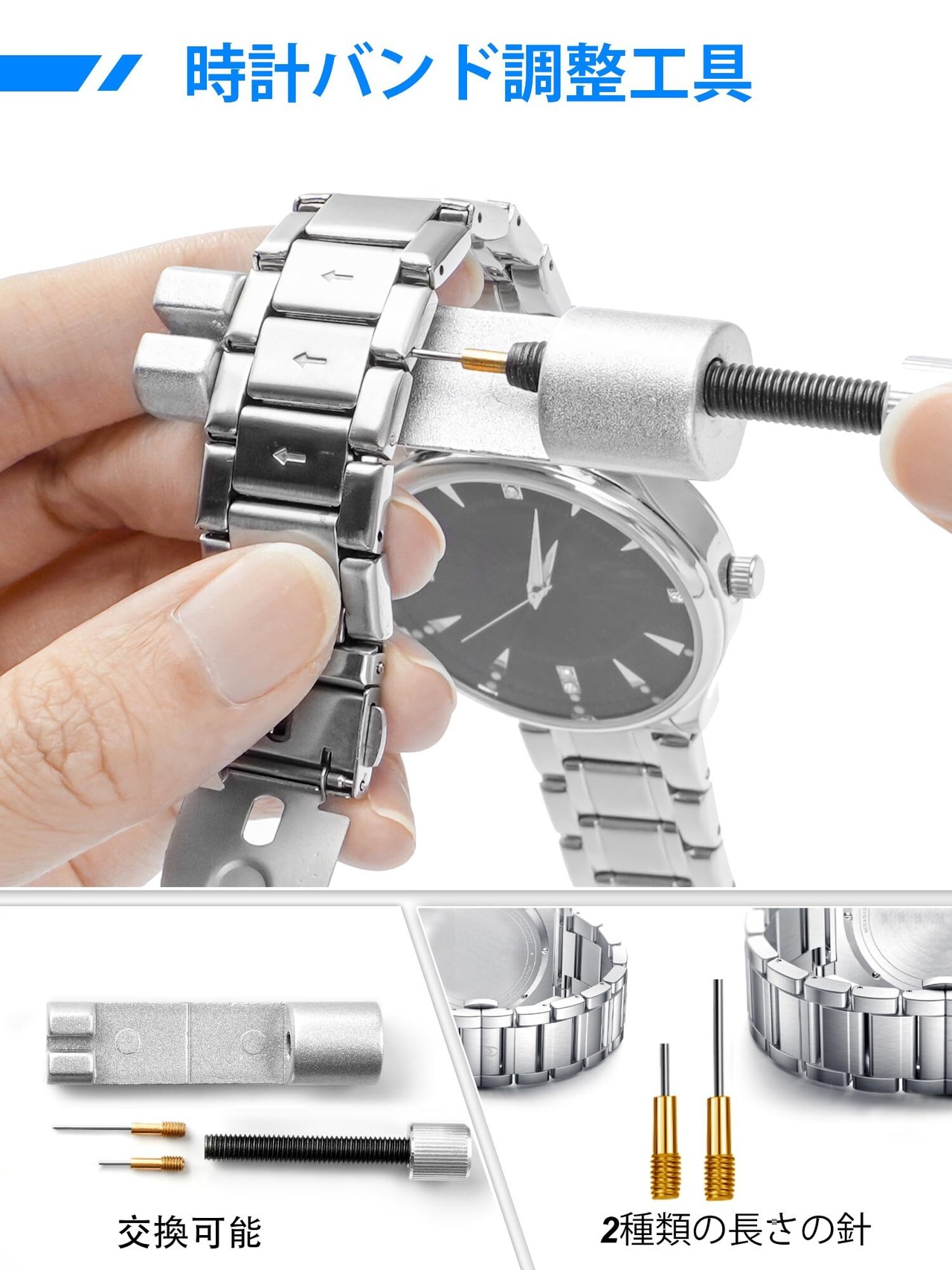 セットには、電池交換用の工具、ベルト調整ツール、ピン抜き工具、腕時計の裏蓋オープナー、バネ棒外しなどが含まれており、これ一つで多様な修理やメンテナンスが可能です。自宅で簡単に時計を手入れできるので、修理工場に出す手間が省けます。