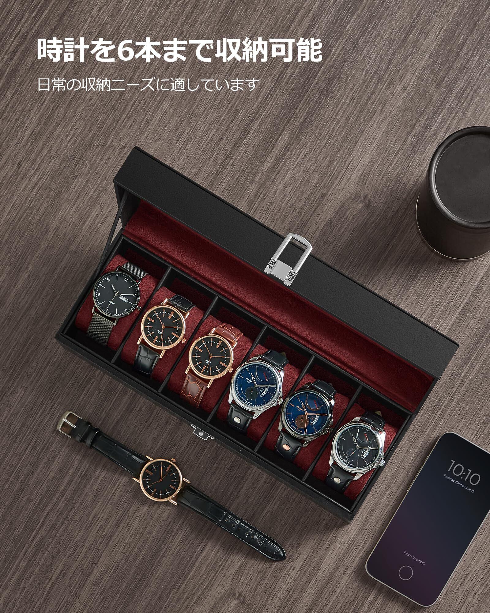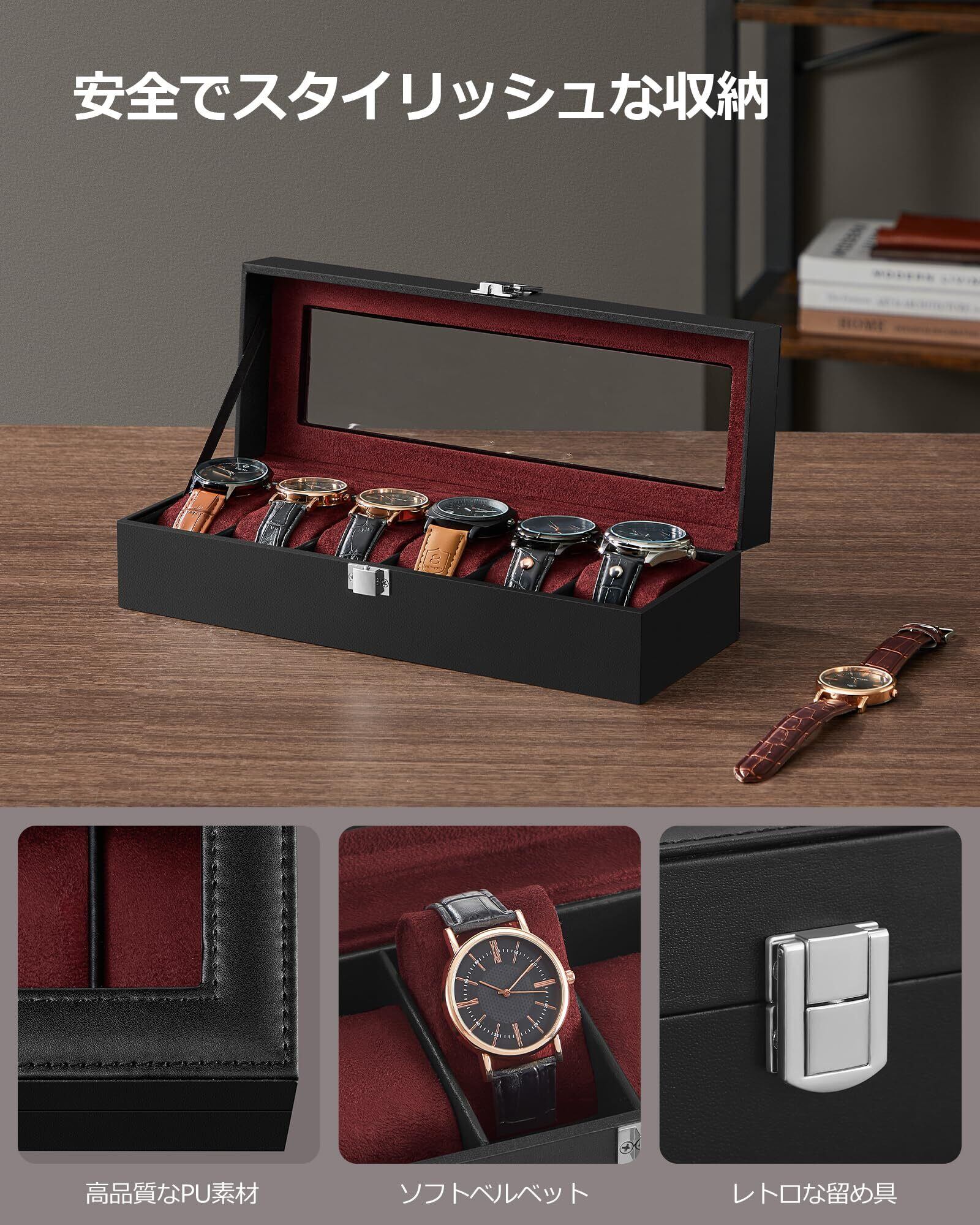 こちらの【SONGMICS 時計ケース】は、6本の腕時計を安全に収納し、あなたのコレクションを美しく保つための理想的なアイテムです。透明な窓のおかげで、お気に入りの腕時計を一目で確認でき、インテリアの一部としても最適です!