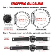 5.互換性のある時計: 時計バンドはAsus Zenwatch & Zenwatch 2; Q, Q Tailor, Q Gazer; Huawei Watch, Watch 2 & Watch 2 Classic; Moto360 Gen2 42mm Men's & Women's & Moto360 Gen2 46mm; LG Watch, Urbane G, Urbane R & Watch Style; Pebble, Pebble 2, Pebble Round Large & most other Pebbles; Gear S2 Classic, S3 Classic, S3 Frontier, Gear Sport; Ticwatch 2 & E; Withings Activite, Steel HR 36mm & Steel HR 40mm など。購入する前に、時計に必要なベルトのサイズを見つけてください。
