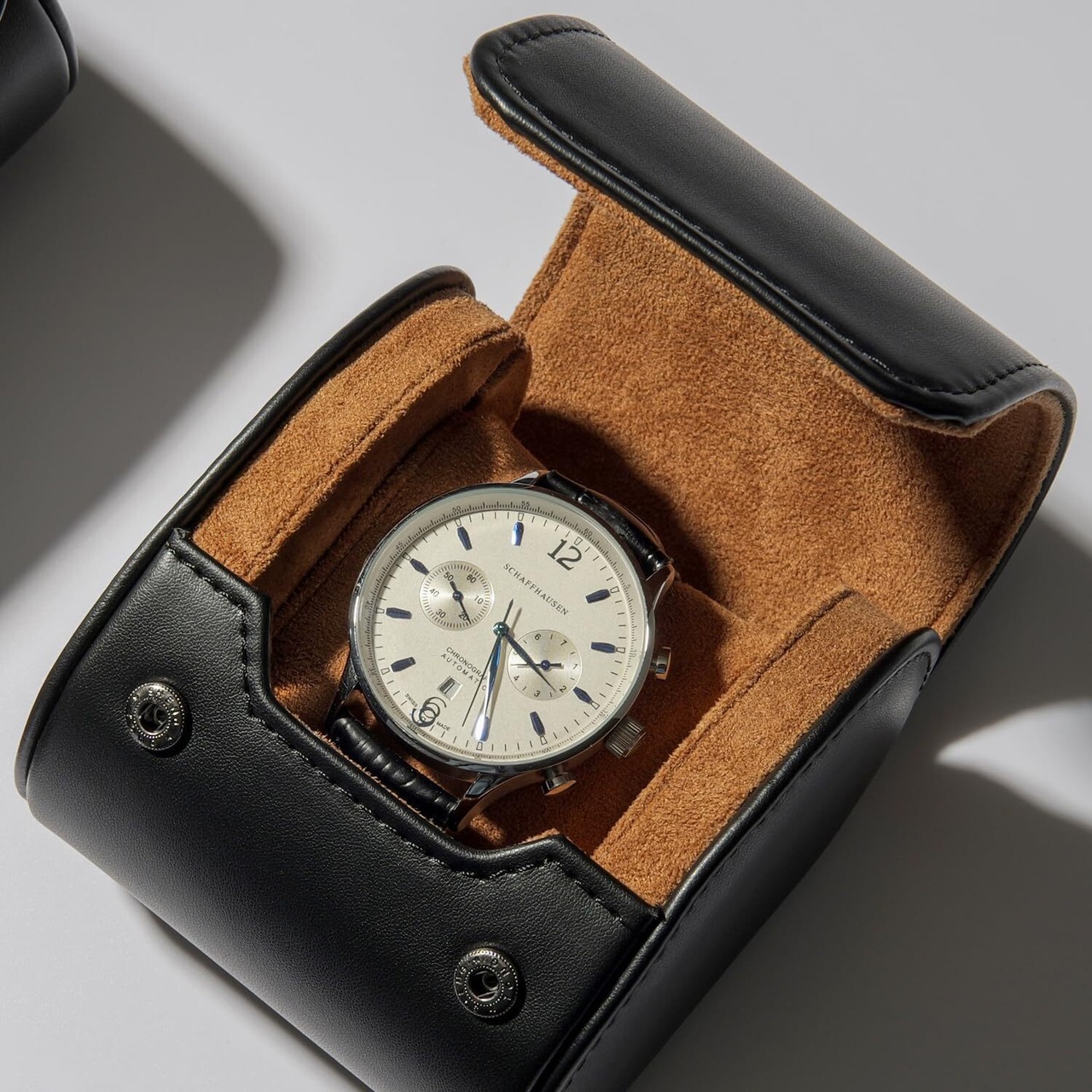 持ち運びやすいコンパクトサイズながら、柔らかい内装が時計をしっかりと包み込み、傷や衝撃から保護します。優れた耐久性を持つPUレザーが、外的要因から時計を守り、安心して保管できます。また、開閉がスムーズなファスナー付きで、手軽にアクセスが可能です。