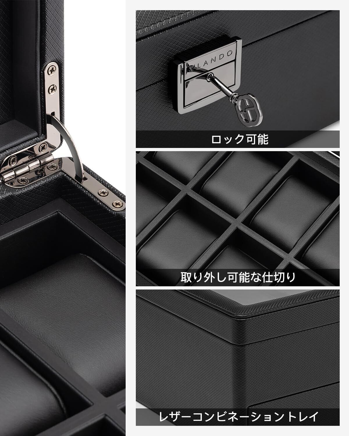 この【Vlando 腕時計ケース】は、10本の腕時計を優雅に収納できる2段式のウオッチボックスです。そのスタイリッシュなデザインは、あなたの腕時計コレクションを見せるだけでなく、部屋のインテリアにも最適です。おしゃれで機能的な収納アイテムをお探しの方におすすめです!