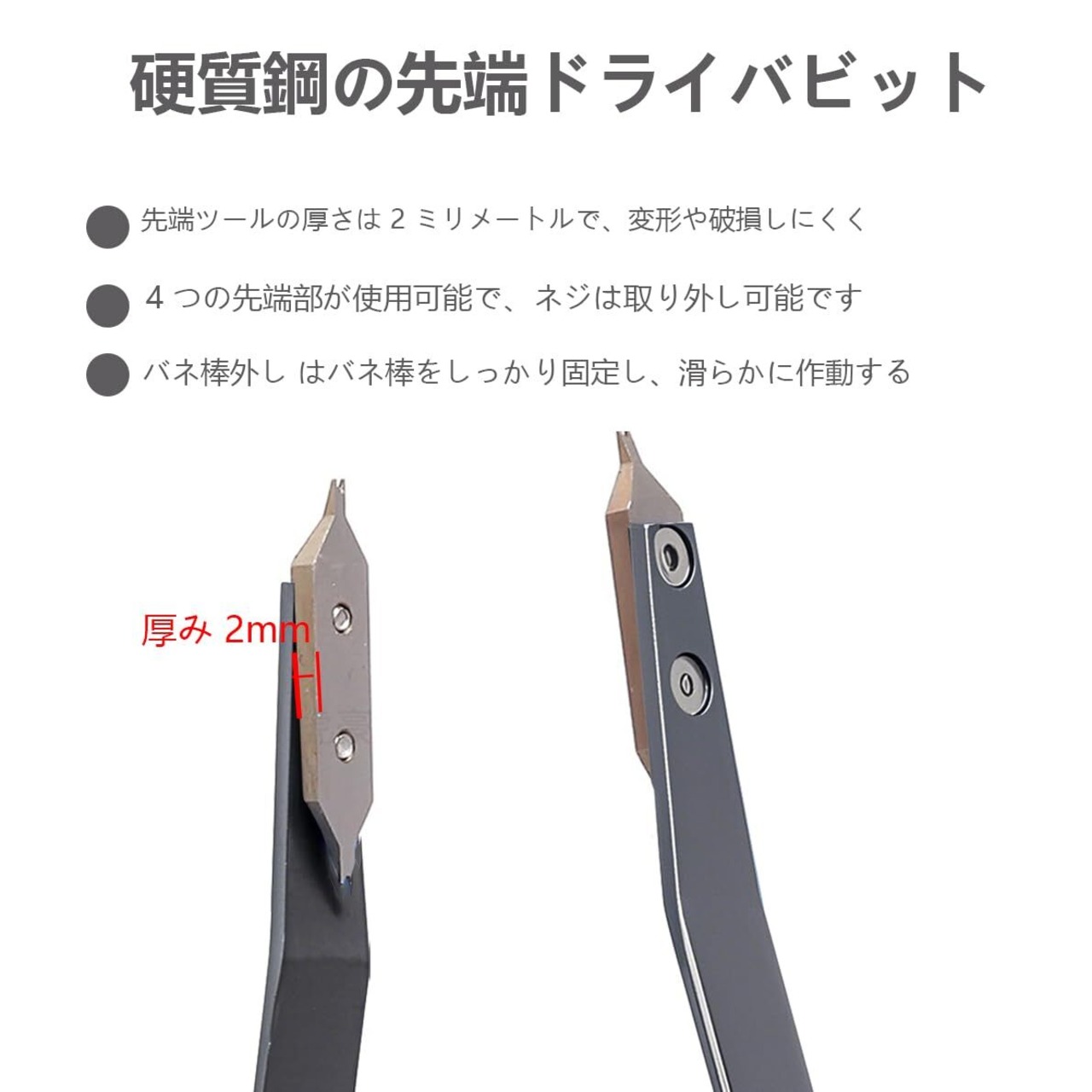 【厚手の素材、丈夫です】時計 バネ棒外しツールはアルミニウム合金素材を採用しており、先端の金属部分は厚みを増やしてあり、硬くて変形を防ぎ、折れることもなく、錆びることもなく、腕時計 ベルト調整 工具毎回の操作が正確に行えるようにしています