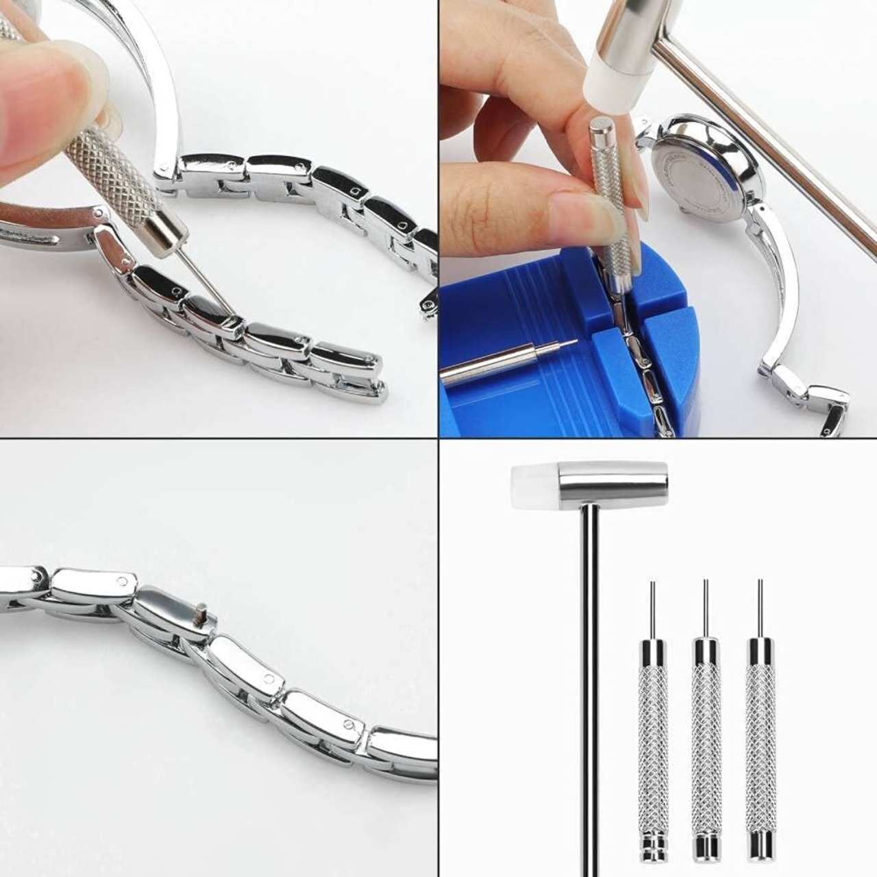 【セット内容】 ミニハンマー*1、バンドピン抜き棒*3、マイナスドライバー*1、バネ棒外し*1、コマはずし*1、ピンセット*1、バネ棒外し器スペアピン*7、交換用ウォッチピン(バネ棒)*180(2.8cm~1.0cm)、腕時計固定器*1、裏蓋開け器*1、三点支持オープナー*1、三点支持オープナー替えビット*18、オープナーナイフ*1、極細繊維クロス *1、専門収納ケース*1。