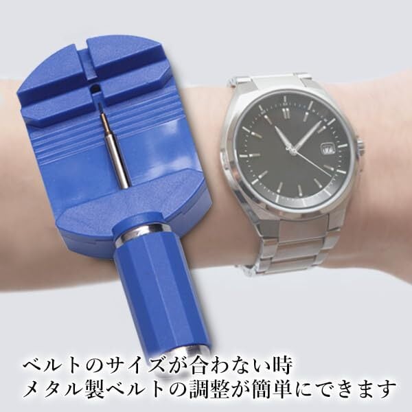 本工具には、腕時計のメタルバンドを簡単に調整できる機能が備わっています。ピン抜き専用の工具も付いているため、初心者でもストレスなく使用することができます。コンパクトなサイズで持ち運びも便利で、どこでも時計の調整が可能です。
