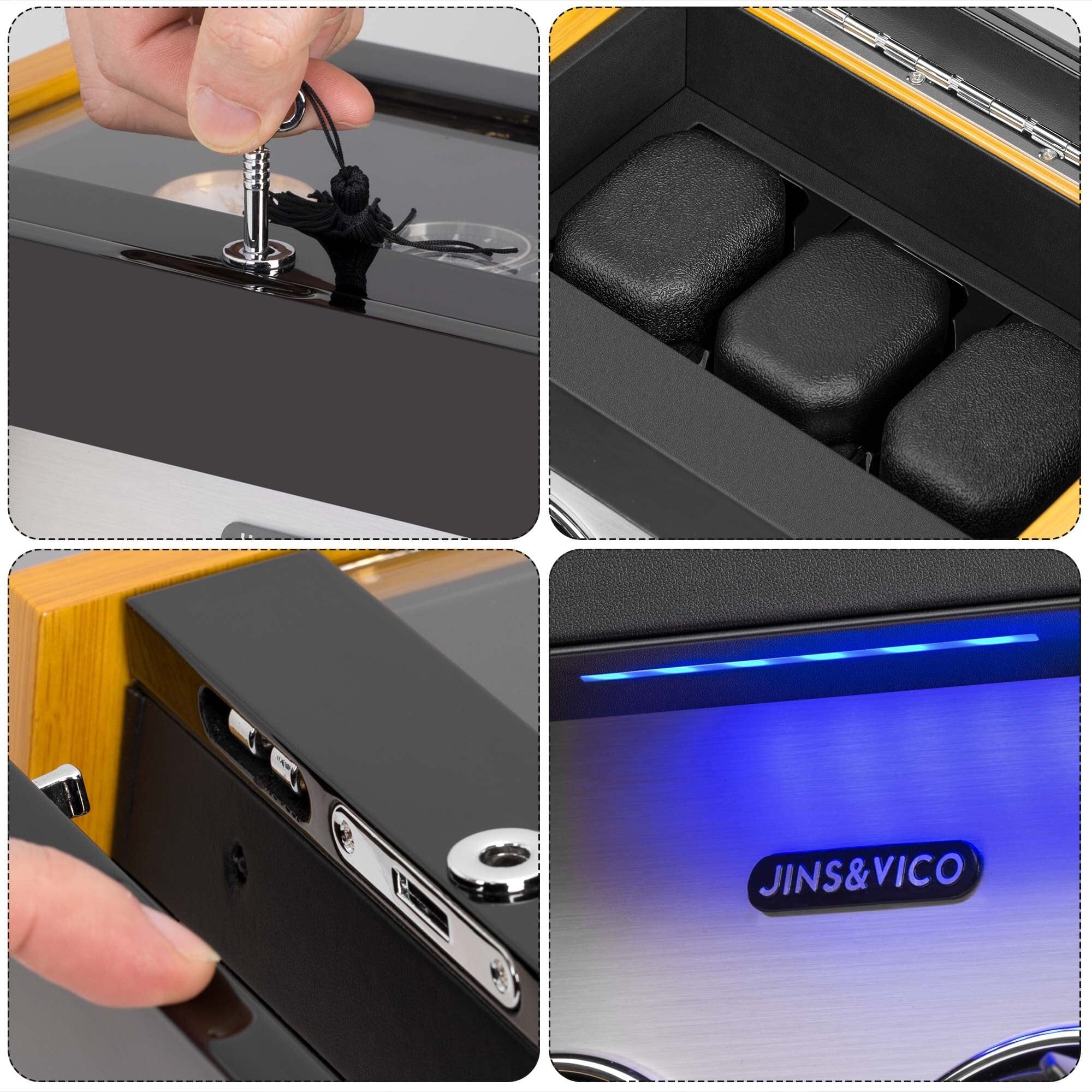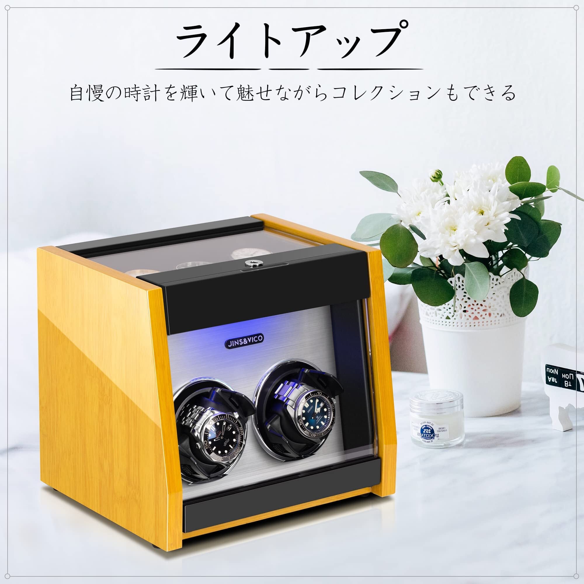 JINS&VICO ワインディングマシーン 2本巻き上げ 3本収納 腕時計自動巻き上げ機 ウォッチワインダー 高級時計ケース 自動巻き 腕時計ワインダー 静音設計 LEDライト付き 蓋を開くと回転停止 ウッド調 LとSサイズクッション1個Mサイズクッション2個が付属
