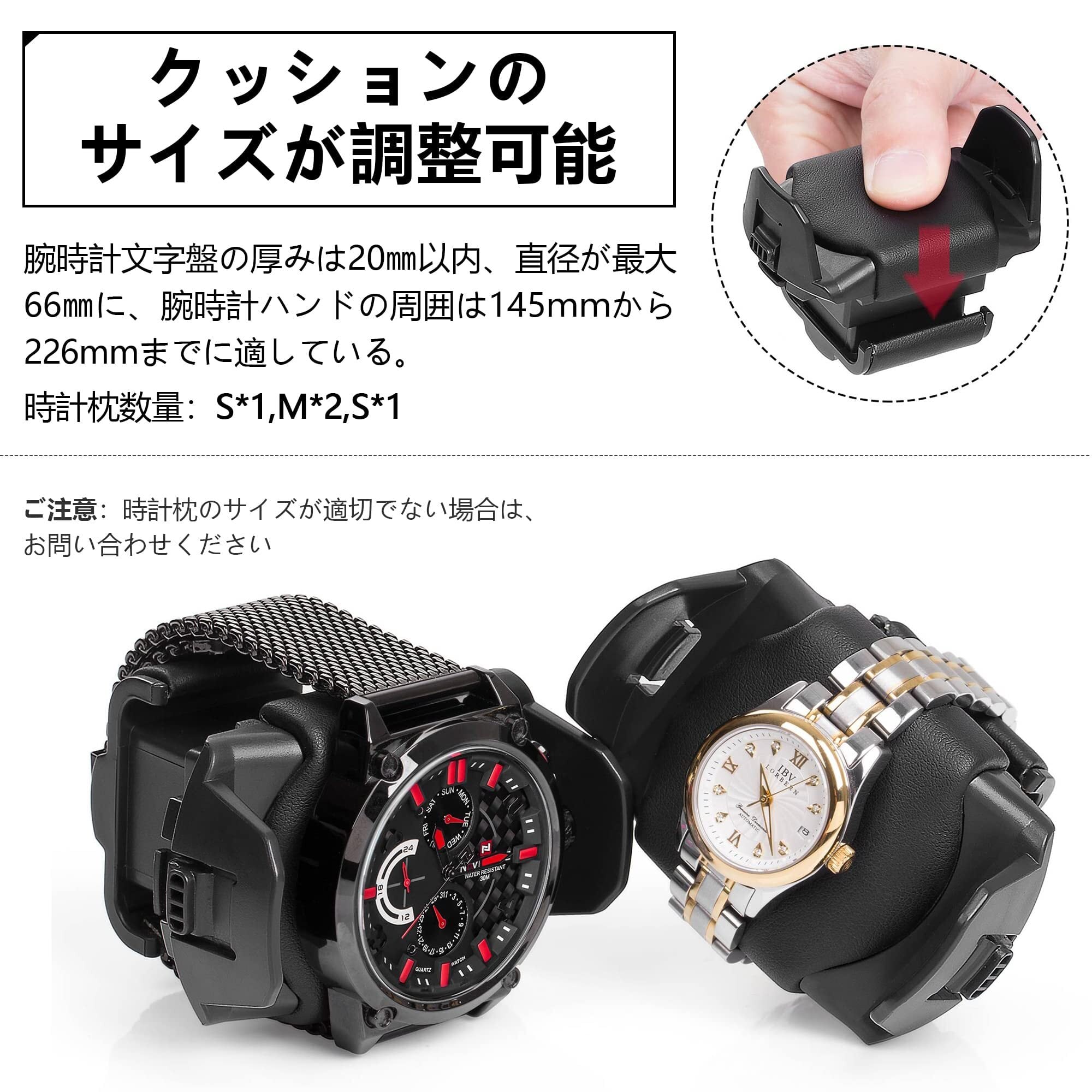 LEDライト付きで、暗い場所でも時計の視認性を向上させます。特殊な設計により、蓋を開くと自動で回転が停止し、お好きなタイミングで時計をご覧いただけます。また、付属のクッションにはLサイズとSサイズが各1個、Mサイズが2個含まれており、さまざまなサイズの腕時計に対応可能です。