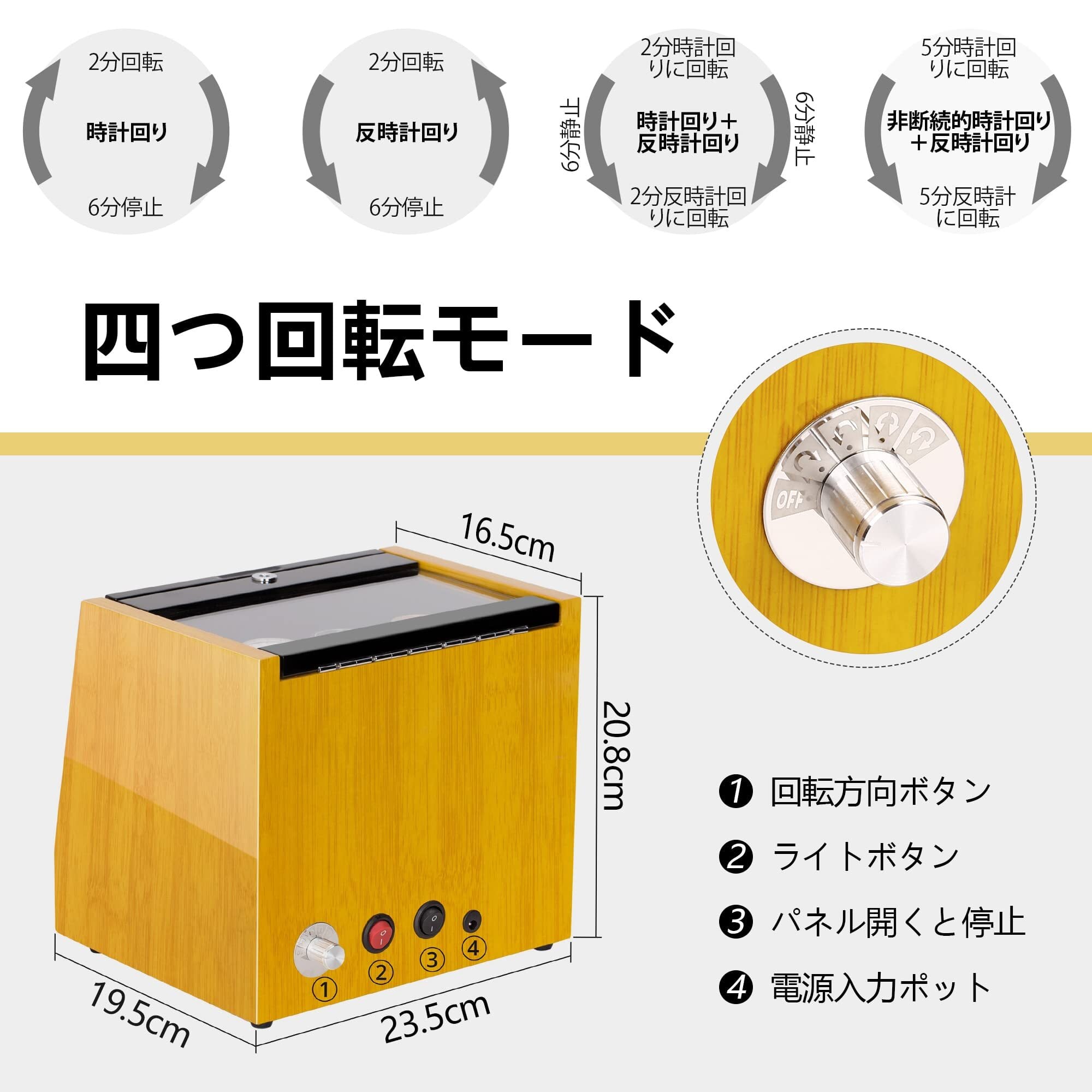 ● 特徴:自動巻き、2本巻き、ウッド調、高級時計ケース、静音設計、LEDライト、蓋を開くと回転停止