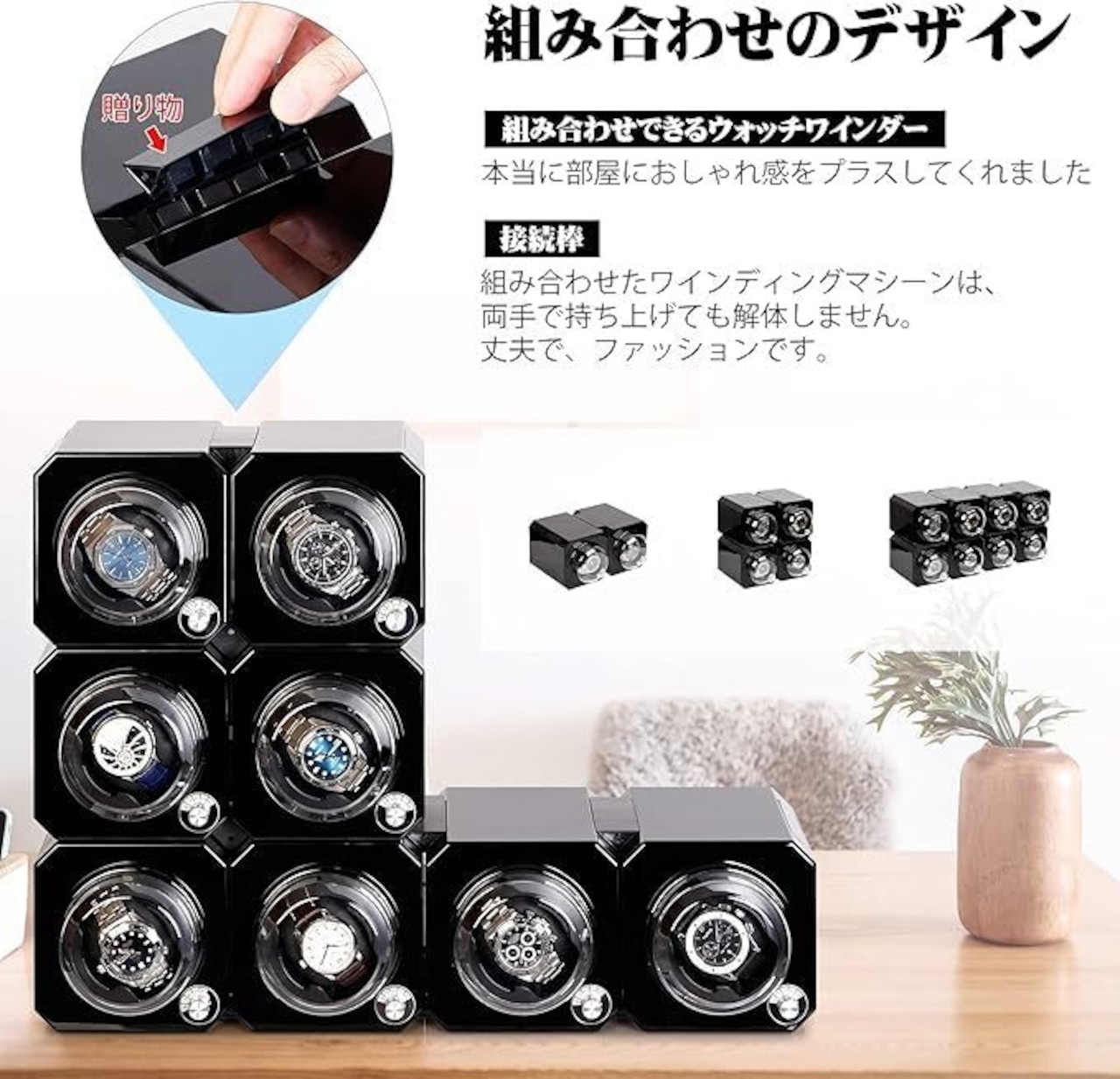 【組み合わせ機能を持ってます】単数のワインディングマシーンは単独で使用できます。複数のワインディングマシーンは組み合わせることができます。単数列と複数列どちらでも組み合わせることができます、複数列で組み立て、最低二列以上です。お好みで組み合わせ方をお選びいただけます。組み合わせたワインディングマシーンは、両手で持ち上げても解体しません。机の上に置くと、ぶつかっても簡単には倒れません。丈夫で、ファッションです。