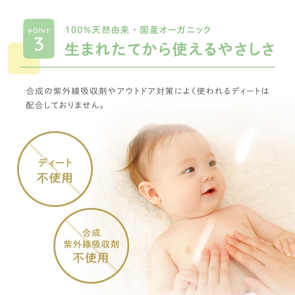 【100%天然由来でディート・合成紫外線吸収剤 不使用】 虫よけやアウトドア対策によく使われるディートや、日焼け止めで使われる合成の紫外線吸収剤を使用せず、肌へのやさしさにこだわった天然由来成分100%。新生児はもちろん敏感肌の大人の方にもおすすめです。