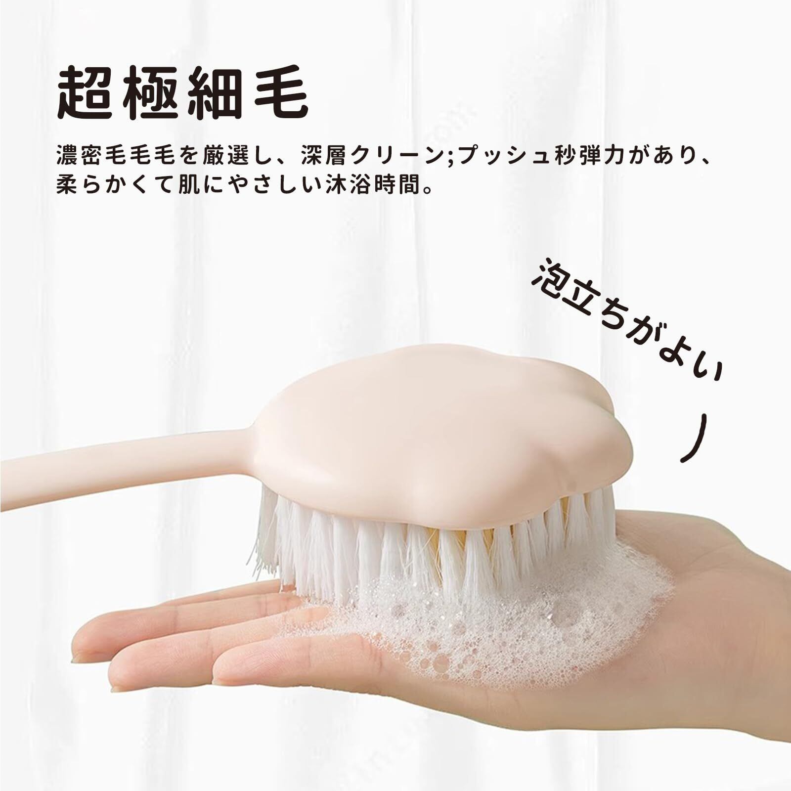 このボディブラシは、柔らかい超極細毛を使用し、背中を優しくケアします。持ちやすいクランクデザインと可愛い猫爪形状で、楽しくスムーズなボディケアを実現します。洗浄しやすく、カビがつきにくい仕様で、いつでも清潔感を保てます。