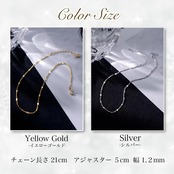 このアンクレットにはアジャスターが付いており、自分の足首に合ったサイズに調整可能です。つけっぱなしで過ごせる設計なので、面倒な付け外しが不要。リラックスした日常からお出かけまで、いつでもおしゃれを楽しめます。