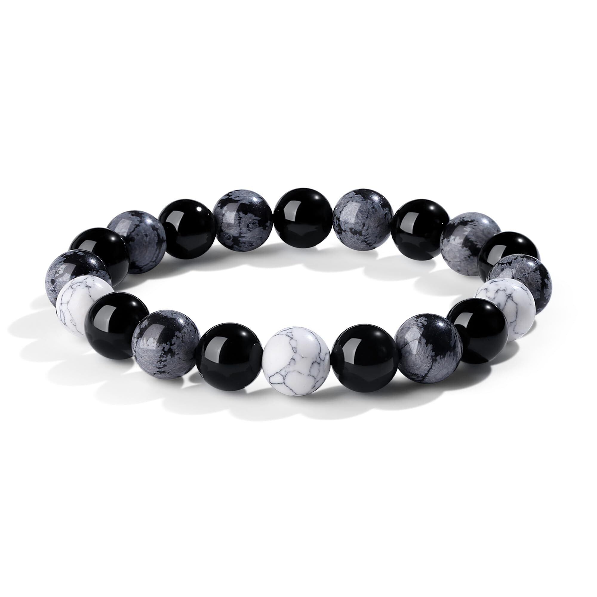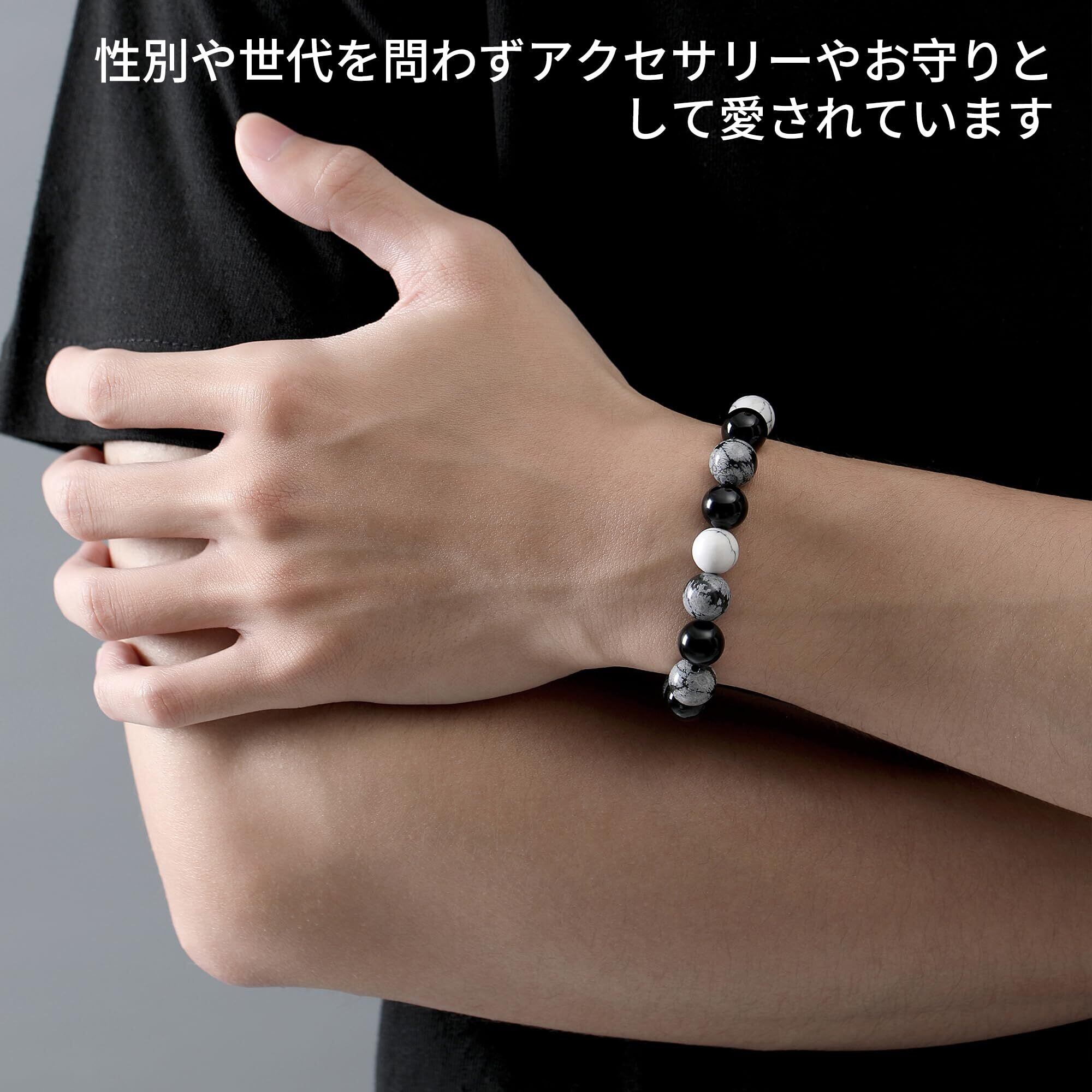 【デザイン】雪の結晶のような斑点模様が見られるスノーフレークオブシディアン。他の石では見られないユニークな見た目が人気を集めています。スノーフレークストーンとハウライトのユニークなテクスチャー、そして色のぶつかり合いは、シンプルでスタイリッシュなブラック、ホワイト、グレーのコンビネーション。 腕元で高いクオリティを発揮し、優しい色合いと、ひとつひとつ表情の違うマーブル模様は男性向けのデザインともよく馴染むのでパワーストーンブレスレットによく使われています。