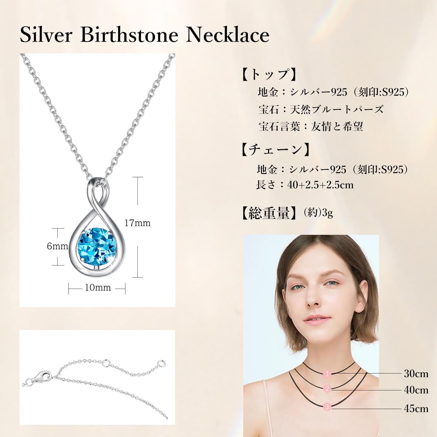 このネックレスは、しずくモチーフのデザインとプラチナメッキ仕上げのシルバー925を使用し、上品さと明るさを兼ね備えています。誕生石を用いることで、個々の誕生月を象徴する特別な意味が込められ、心温まる贈り物としても最適です。