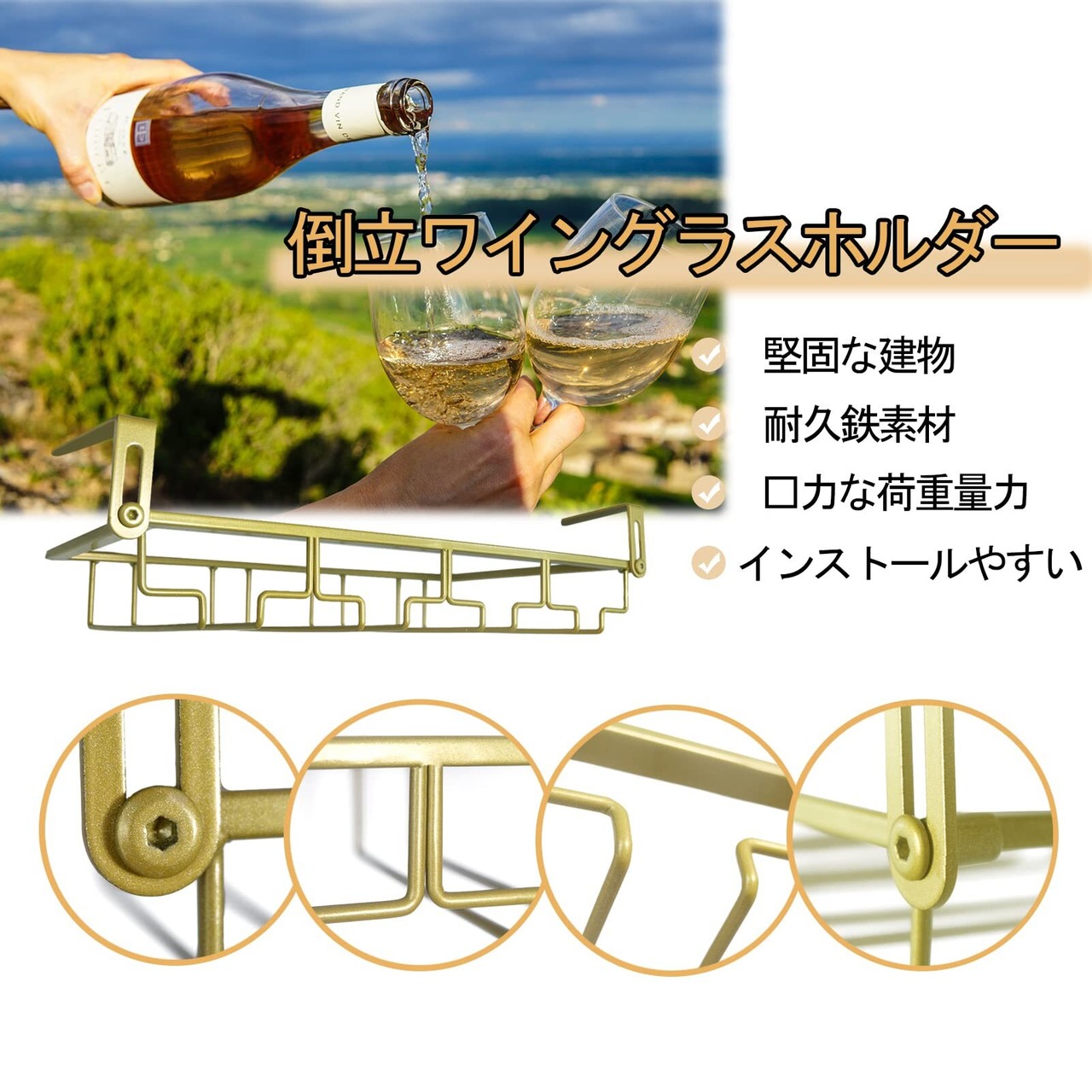 【特価セール】ワイングラスホルダー 吊り下げ 穴あけ 不要 ネジ止め不要厚さ調節可能 キッチン 4列の金色です
