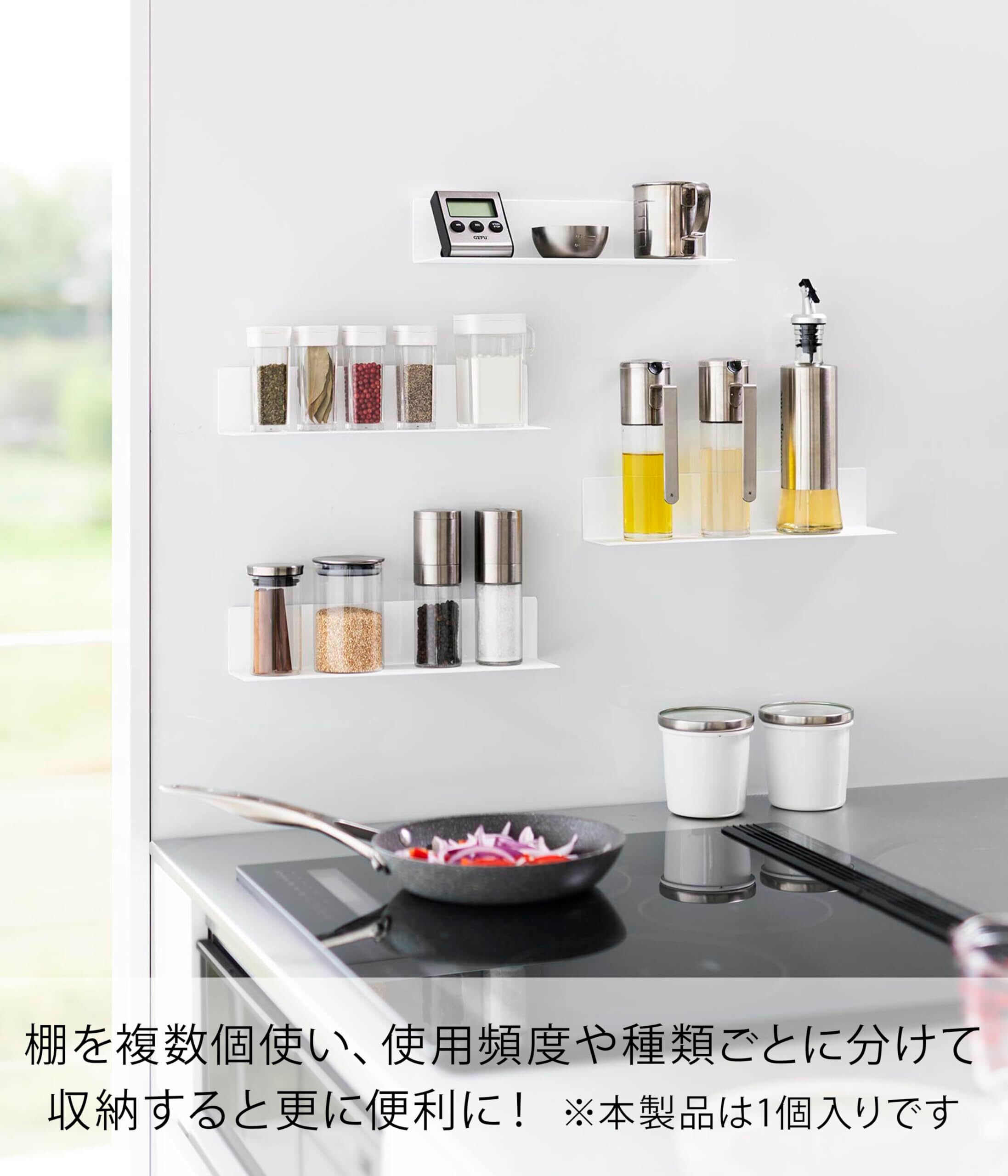 「スペースを有効活用する[マストアイテム]、山崎実業のマグネットキッチン棚があなたのキッチンスペースをスッキリさせます!シンプルでスタイリッシュなホワイトデザインは、どんなインテリアにもマッチし、調味料や小物の収納に最適です。」