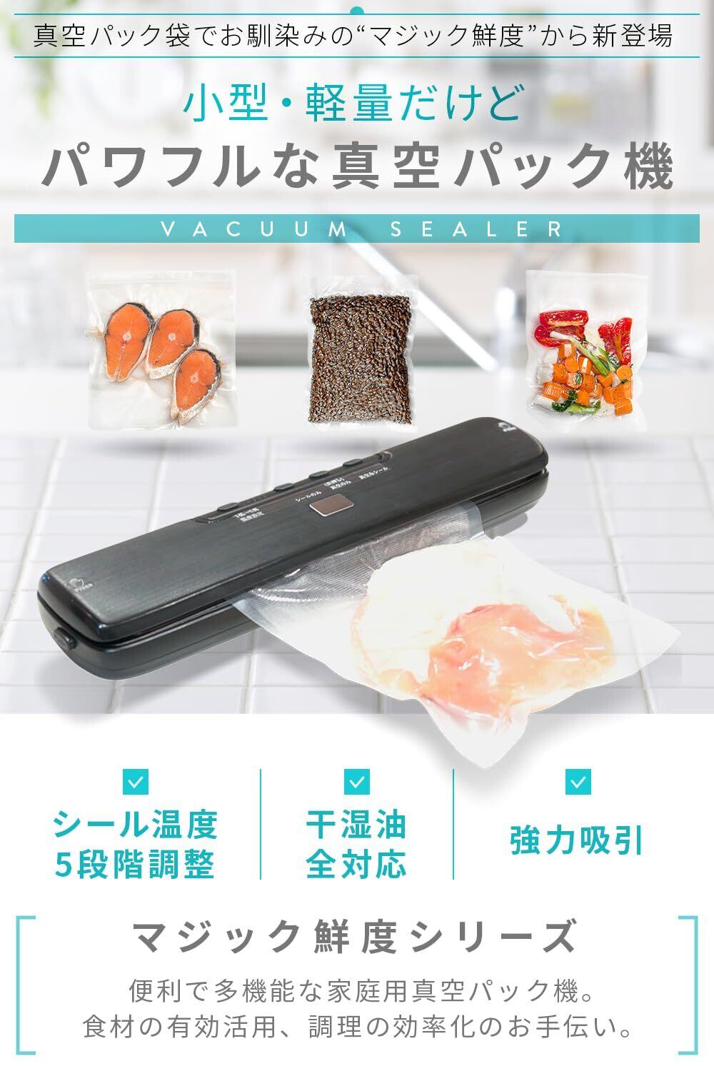【マジック鮮度 真空パック機】小型だけど、本格派!小型・軽量モデルながら、食材の鮮度をしっかり維持します。食材を真空パックすることで、酸化を防止し、劣化や腐敗から守ります。強力な真空パッキング機能と熱シールの調整機能が、高い調理パフォーマンスを実現しました。ヒートシーラーとしてもご使用いただけます。キッチンや収納スペースにも取り入れやすく、使い勝手が向上しました。 本商品は、東京都港区発の日本メーカー企画商品です。 代表自身が某有名真空パック機を使用していた際、専用の真空パック袋が高価であることに疑問を感じました。「同じ仕様や品質で、もっと手頃に使えるものがあればいい」 そんな思いから誕生したのが 「マジック鮮度シリーズ」 です。 さらに、生産は当社提携の中国工場にて行い、仲卸業者や代理店を通さず、企画から輸送、販売までを一貫管理。これにより、高いコストパフォーマンスと優れたクオリティの両立を実現しました。 日々の食材保存をより便利に、より快適にするための一品をぜひお試しください。