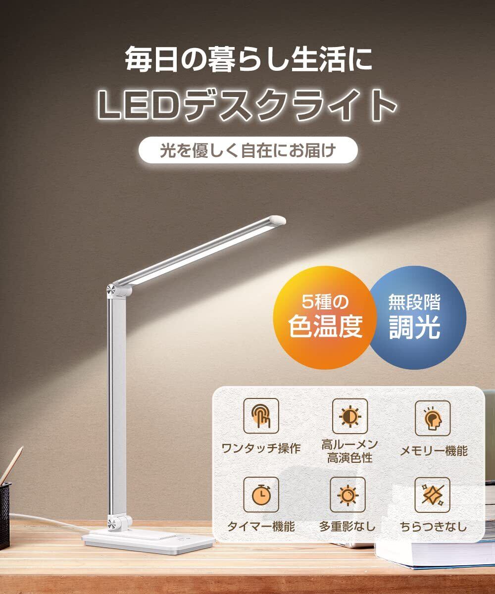 【2025革新モデル】 デスクライト LED スタンドライト 目に優しい 電気スタンド 省エネ 卓上 調色5段階 無段階調光 明るい ブックライト タッチセンサー 多角度調整 読書灯 折り畳み式 コンパクト 簡単操作 USB給電式 メモリー機能 タイマー テーブルライト USBポート 台灯 寝室/勉強/仕事/学習机 type-C(ホワイト&シルバー)