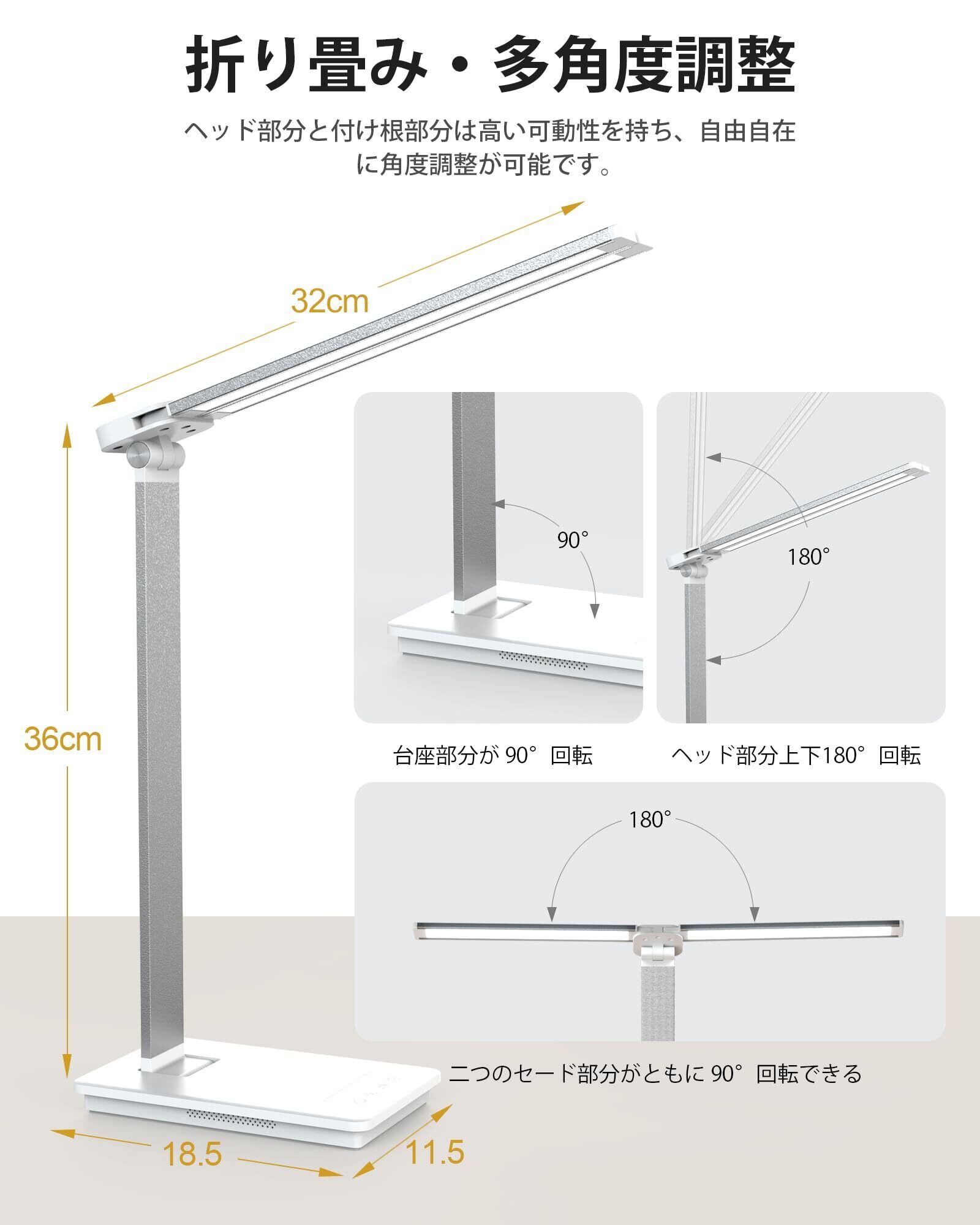 【折りたたみ式アームとダブルヘッドで自在な調整】高品質なアルミ素材を使用し、アームの角度や高さを自由に調整できるため、照明の角度をお好みで変えられます。ダブルヘッドデザインにより、広範囲に光を拡散し、デスク全体を均一に照らすことが可能です。影が気になる場面では、2つのライトヘッドの向きを調整することで、影を最小限に抑えることができます。使用後はコンパクトに折りたたんで収納でき、デスクスペースをすっきりと保つことができます。